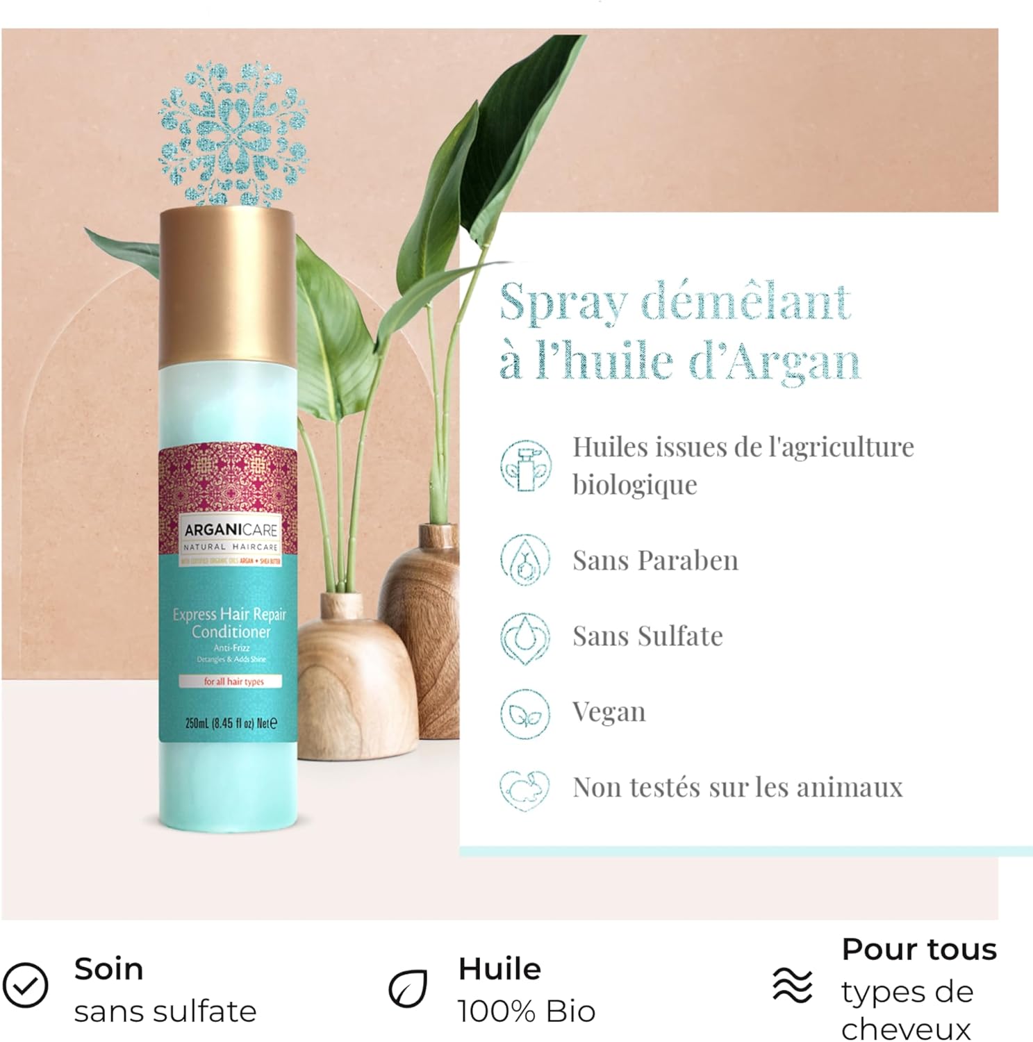 About this item EXPRESS DETANGLING AND REPAIR SPRAY | This hair spray is both a restorative treatment and a leave-in detangler that instantly brings strength and shine to the hair and immediately makes styling easier. THE BENEFITS OF SPRAY | Thanks to its formula enriched with argan, silk proteins and keratin, this spray fills damaged areas of the hair fiber, restructures it and limits frizz and split ends. THE VIRTUES OF ARGAN | Argan oil is rich in nourishing fatty acids and tocopherol with natural anti-inflammatory effects. It repairs and revitalizes the hair, preserves its hydration level and makes it silky. USER TIPS | Spray the product on damp hair by applying one or two pressures on your Arganicare spray. This is designed as a leave-in treatment, so there is no need to rinse after application. THE ARGANICARE BRAND | Arganicare has developed a vast range of high-end beauty products (hair care, serums, masks, skin care) based on argan oil and other effective active ingredients with recognized actions. › See more product details,EXPRESS DETANGLING AND REPAIR SPRAY | This hair spray is both a restorative treatment and a leave-in detangler that instantly brings strength and shine to the hair and immediately makes styling easier,THE BENEFITS OF SPRAY | Thanks to its formula enriched with argan, silk proteins and keratin, this spray fills damaged areas of the hair fiber, restructures it and limits frizz and split ends,THE VIRTUES OF ARGAN | Argan oil is rich in nourishing fatty acids and tocopherol with natural anti-inflammatory effects. It repairs and revitalizes the hair, preserves its hydration level and makes it silky,USER TIPS | Spray the product on damp hair by applying one or two pressures on your Arganicare spray. This is designed as a leave-in treatment, so there is no need to rinse after application,THE ARGANICARE BRAND | Arganicare has developed a vast range of high-end beauty products (hair care, serums, masks, skin care) based on argan oil and other effective active ingredients with recognized actions