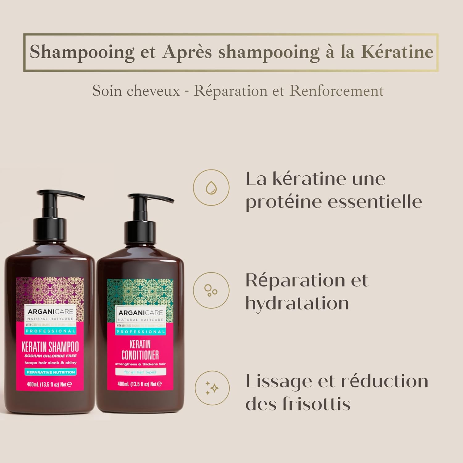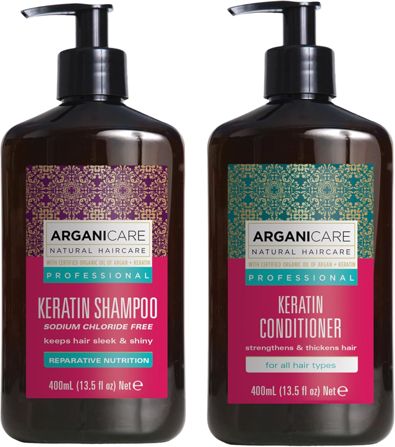 Arganicare | Keratin Shampoo + Conditioner | Regenerates Hair Intensely | Prevents And Treats Split Ends | Soft, Silky, Shiny Hair | Made In France | 2X400Ml