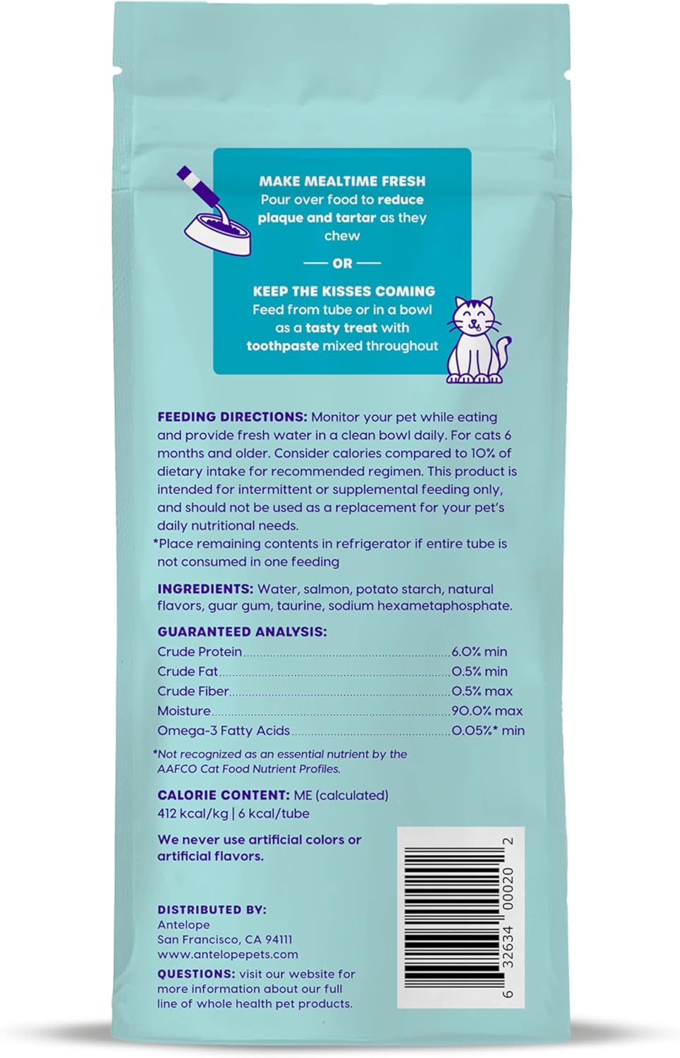 Over 70% Of Cats Have Some Form Of Periodontal Disease By At Age. But We Want To Keep The Kisses Coming! Can Be Given As A Treat Straight From The Tube Or Poured Over Food To Help Reduce Plaque And Tartar. Mixed With Toothpaste Throughout Makes Mealtime Fresh. Freshen Breath With Daily Licking. We Never Use Artificial Colors Or Artificial Flavors. Made With Our Feline Favorite Salmon Recipe That Will Keep Them Meowing For More!