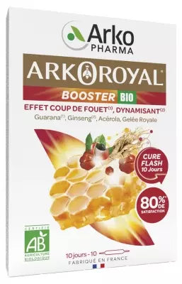 Arkopharma Arko Royal Booster Organic 10 Phials Is A Food Supplement That Contains A Complex Of Energy Boost Based On Guarana With Stimulating Properties, Ginseng With Fortifying Properties To Diminish The Fatigue Sensation, Acerola And Royal Jelly. Certified Organic Farming. Control Fr-Bio-01. Made In France