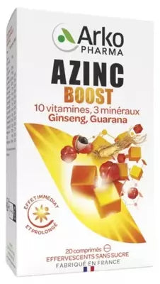 Arkopharma Azinc Boost 20 Effervescent Tablets Is A Food Supplement Developed To Improve Physical And Intellectual Performances In Immediate And Durable Way. It Associates 10 Vitamins, 3 Minerals, 2 Plant Extracts And Caffeine 100% Vegetable To Help To: Bring An Immediate "Boost" Effect During Intense Activities Periods (Exams, Stress, Overwork, Sports Activities, Etc.) And Reduce Fatigue, Thanks To Guarana And Caffeine, Support Intellectual Performances Thanks To Vitamin B5 And Maintain The Good Functioning Of Nervous System Thanks To Vitamins B2, B3, B6, B8, B12. Find Energy And Vitality In Durable Way Thanks To Ginseng And Magnesium, And Stay In Shape Thanks To Vitamin C And Zinc Which Contribute To The Proper Functioning Of The Immune System. Sugar Free. Made In France