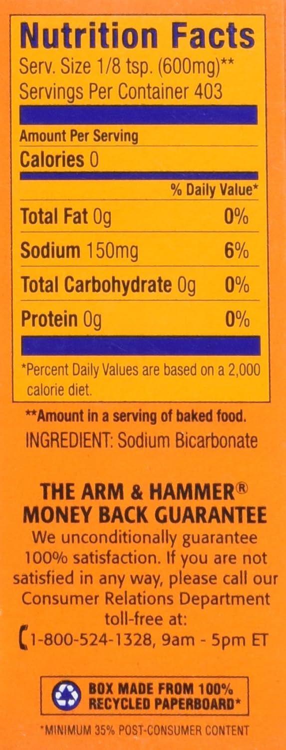 Product Description Arm & Hammer Baking Soda Pure, Safe & Natural America's #1 trusted baking soda brand! Uses. Relieves: - Heartburn; - Acid Indigestion; - Sour Stomach; - Upset stomach due to these symptoms. For scratch-less cleaning. Scrubs away stains and grease without scratching. - Sinks; - Counters; - Ovens; - Refrigerators; - Coffee Pots; - Tile & Grout; - Microwaves; - Pots & Pans; - Stainless Steel; - China. - Prepare and Use: Directions Add 1/2 teaspoon to 1/2 glass (4 fl. oz.) of water every 2 hours, or as directed by physician. Dissolve completely in water. Accurately measure 1/2 teaspoon. Do not take more than the following amounts in 24 hours: Seven 1/2 teaspoons Three 1/2 teaspoon if you are over 60 years Do not use the maximum dosage for more than 2 weeks. Change every 30 days Use a new box each month for fresher tasting food Warnings Ask a doctor before use if you have a sodium restricted diet. Ask a doctor or pharmacist before use if you are taking a prescription drug. Antacids may interact with certain prescription drugs. Do not administer to children under age 5. Stomach Warning: To avoid serious injury, do not take until powder is completely dissolved. It is very important not to take this product when overly full from food or drink. Consult a doctor if severe stomach pain occurs after taking this product. Stop use and ask a doctor if symptoms last more than 2 weeks. Ingredients Sodium Bicarbonate P.when('A').execute(function(A) { A.on('a:expander:toggle_description:toggle:collapse', function(data) { window.scroll(0, data.expander.$expander[0].offsetTop-100); }); }); Directions Add half teaspoon to half glass (4 fl. oz) of water every 2 hours, or as directed by physician. Dissolve completely in water. Accurately measure half teaspoon. Manufacturer Contact Information Arm & Hammer See more,Packaging Info: Cardboard recyclable,Store in a cool dry place,Country of Origin: USA,Bicarbonate of Soda
