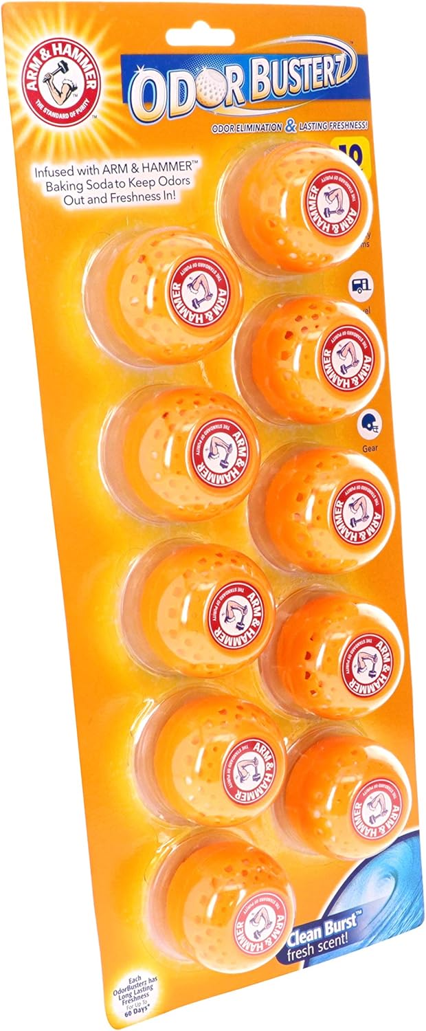 Arm and Hammer, a household hero, has proudly been at your side for more than 175 years. To the to-do list tacklers, the can-doers and those that kick odors to the curb, we've got your back. Odor Busterz’ unique perforated ball allows maximum odor elimination from Arm and Hammer natural baking soda, allowing you to deodorize at home and on the go. At home, they’re perfect for hampers, wastebaskets, closets, bathrooms, stinky clothes…and much more! Or take them on the go, for backpacks, gym bags, car trunks, lockers, athletic & camping gear, travel bags… and so much more! Each ball eliminates odors for 60 days with Arm and Hammer’s best-selling Clean Burst scent,10 Pack makes it easy to put one in every essential place around the house- perfect for closets, hampers, travel bags, shoes, athletic gear, trash cans, & much more!,Eliminates odors for 60 days!,Natural & effective odor elimination,Deodorizing balls filled with odor eliminating baking soda and Arm & Hammer clean burst fresh scent,Keeps odors out & freshness in