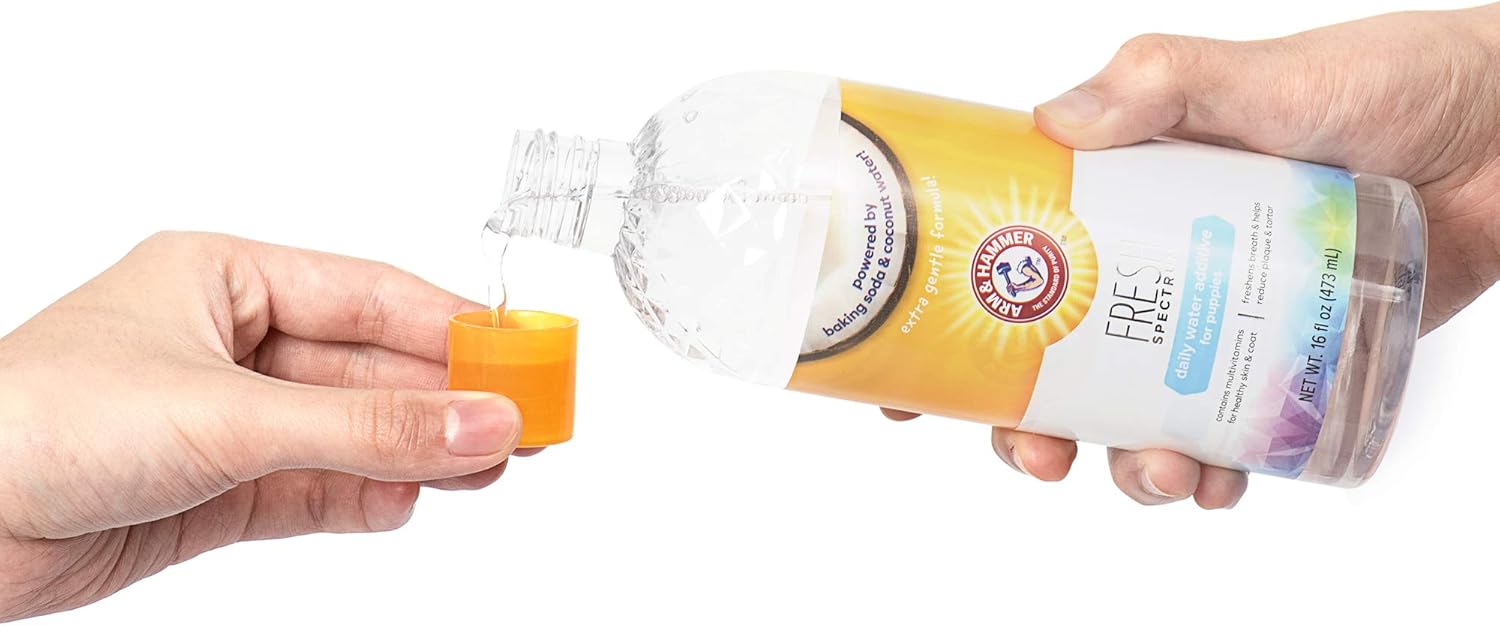 Product Description The Arm & Hammer name has been trusted for over 100 years for gentle yet effective cleaning. Arm & Hammer Fresh Spectrum Dental Care for Pets brings those same cleaning methods to our companion animals, making it easy for pet parents to provide dental health solutions that work. The Fresh Spectrum line introduces a whole new and easy way to make dental care fun and simple for both pets and their owners. The Arm & Hammer Fresh Spectrum Dog Daily Water Additive fights bad breath by killing odor causing bacteria, helping control plaque and tartar, whitening teeth, and improving overall oral health. This flavorless solution is easy to use and administer for pets. The signature baking soda infused formula for which Arm & Hammer is known is also found in this dog dental care product to further enhance better breath and whiten teeth. This water additive for dogs also has coconut water for a fresh take on pet health. Add to your dog's daily water for fresher breath. Deodorize and strengthen your pet's oral health to prevent disease with Arm & Hammer Fresh Spectrum.DIRECTIONS: Shake well before use. Add one capful per 8 oz of your dog's drinking water once a day. Wash your pet's water bowl thoroughly before refilling it. Always follow directions on packaging and consult with your veterinarian for additional advice before administering dental water additives for dogsYOUR SATISFACTION IS OUR PRIORITY: If you have any questions or feedback, please reach out to us directly at info@fetch4pets Directions Shake well before use. Add one capful per 8 oz of your dog's drinking water once a day. Wash your pet's water bowl thoroughly before refilling it. P.when('A').execute(function(A) { A.on('a:expander:toggle_description:toggle:collapse', function(data) { window.scroll(0, data.expander.$expander[0].offsetTop-100); }); }); Safety Warning Keep out of reach of children. If ingested by pets, seek veterinary advice. Avoid contact with eyes. If contact occurs, rinse thoroughly with water. See more,ARM & HAMMER DENTAL CARE FOR DOGS β Take your dog's dental care to the next level with Arm & Hammer Fresh Spectrum water additive drops to eliminate bad breath, fight plaque and tartar, and leave them with a bright, white smile,INFUSED WITH BAKING SODA & COCONUT WATER β Arm & Hammer Dog Dental Care daily water additive is infused with the signature Arm & Hammer baking soda ingredient to freshen breath while killing odor causing bacteria. It also has Coconut water in this water additive for dogs keeps their breath smelling fresh and their teeth nice and white,DIRECTIONS β Shake well before use. Add one capful per 8 oz of your dog's drinking water once a day. Wash your pet's water bowl thoroughly before refilling it,TARTAR AND PLAQUE CONTROL βNot only does this dog dental care water additive for pets freshen breath, but it also helps control plaque and tartar to prevent tooth decay and gum disease,FLAVORLESS DAILY WATER ADDITIVE β Cleaning your dog's teeth and freshening their breath is super easy with this unflavored, flavorless dog water additive