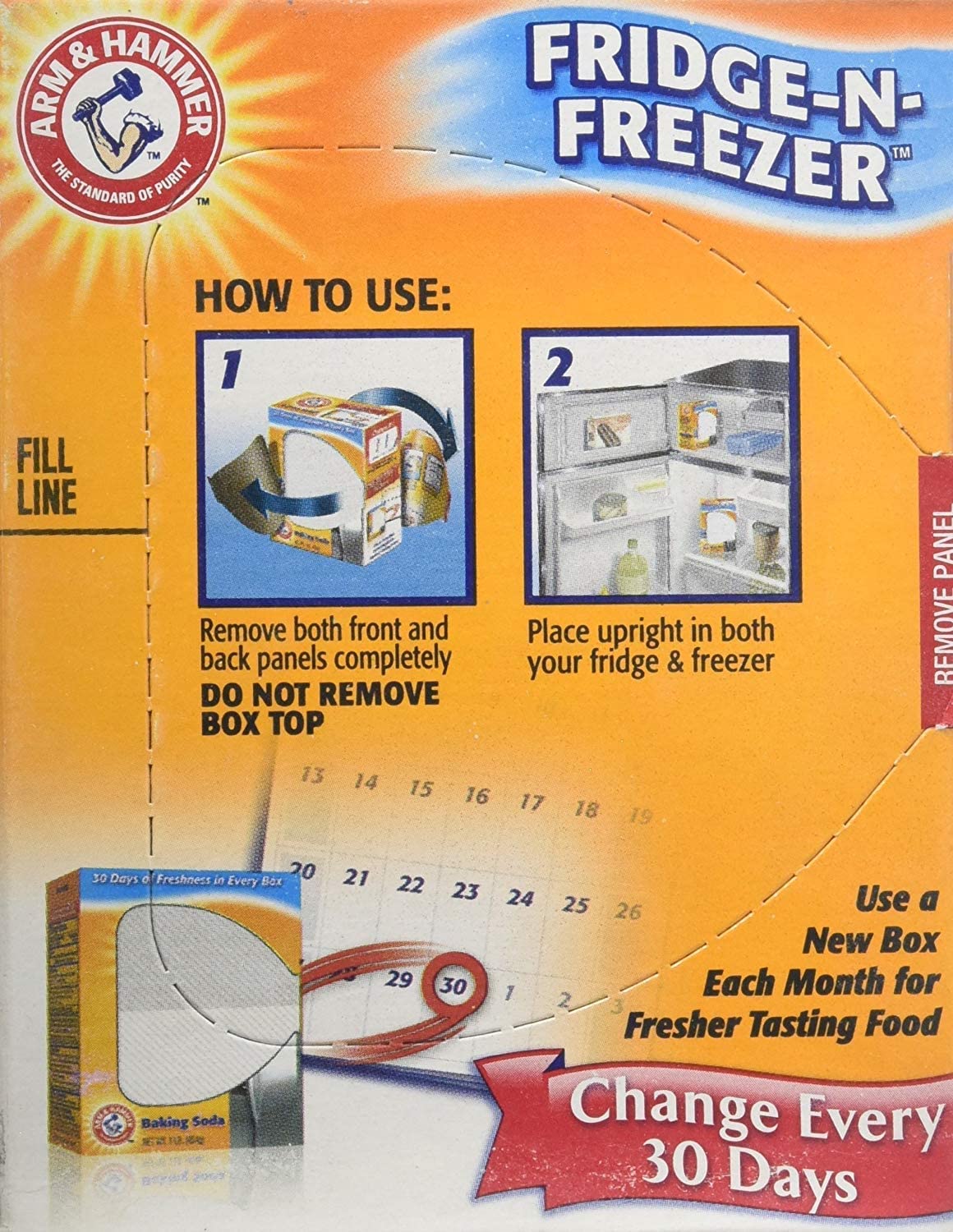Product Description This hard-working spill-proof box helps keep your food tasting like it should. The removable front and back panels let air flow through the box (without messy spills!) for maximum freshening power in your refrigerator, freezer, or any enclosed space where odors tend to linger (like your microwave and closets!). To keep everything fresh, make sure to change your Fridge-n-Freezer box every 30 day Ingredients Sodium Bicarbonate P.when('A').execute(function(A) { A.on('a:expander:toggle_description:toggle:collapse', function(data) { window.scroll(0, data.expander.$expander[0].offsetTop-100); }); }); Manufacturer Contact Information Arm & Hammer See more,Arm & Hammer Fridge-N-Freezer Odor Absorber Baking Soda ? Spill-Proof Package,Absorbs and deodorizes food odor ? Dual panel flow-through vents for max odor control,Helps keep food tasting fresh, longer ? For best results, replace every 30 days,Only One with Flo-Thru Technology ? Use a New Box Each Month for Fresher Tasting Food,Pack of 3