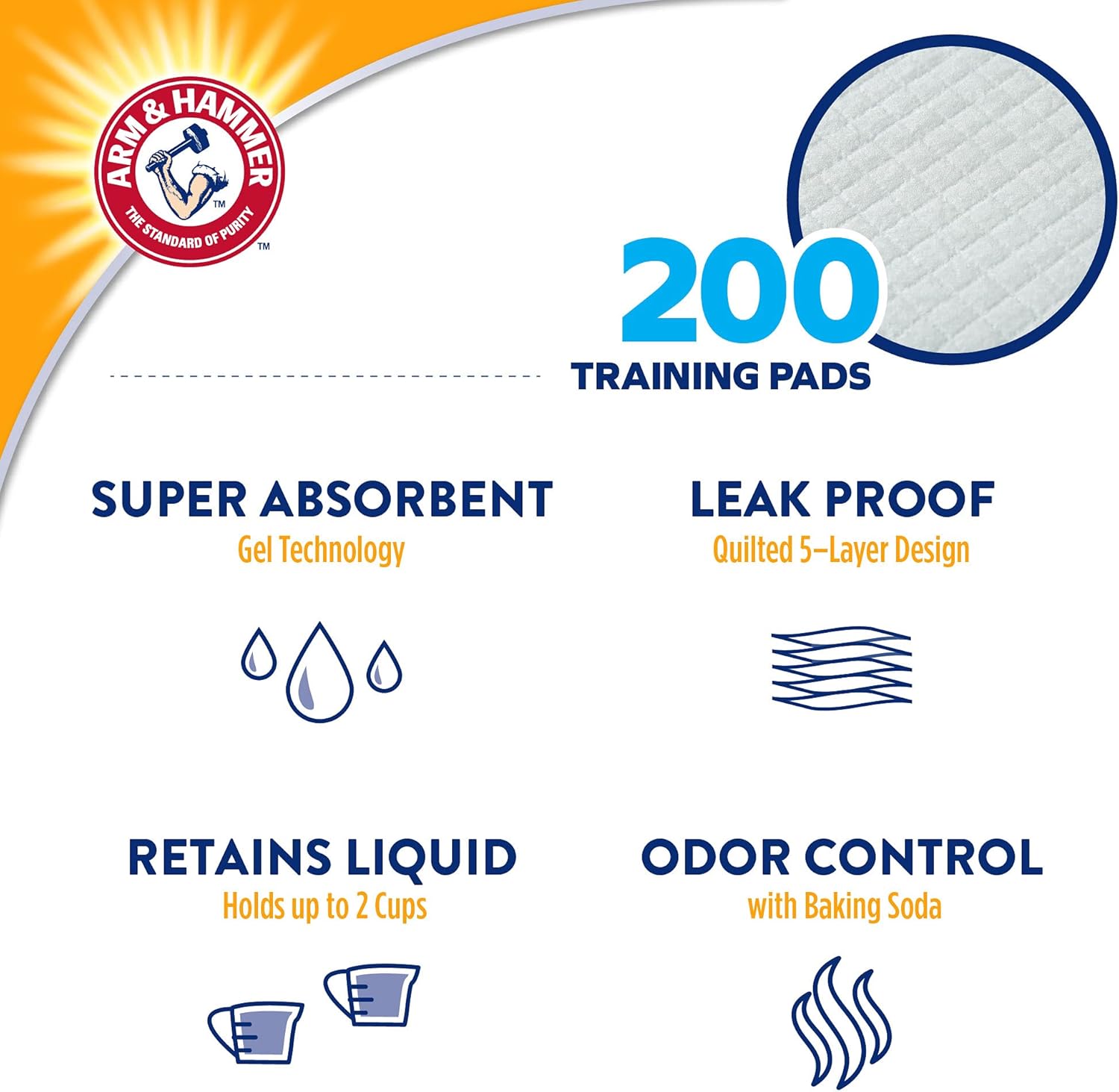 Product Description Arm & Hammer Training Pads for Stay-at-Home Dogs are a leak-proof solution to training your pet. The classic Arm & Hammer baking soda ingredient neutralizes odors. With a quilted pattern to lock in urine and 5 layers of leak-proof protection, the new and improved super absorbing polymer gel technology solution makes Arm & Hammer doggy pads the go-to product for at-home dogs. Directions Place pad on floor, quilted side up. Guide pet to pad to sniff. Reward when pet successfully uses pad. Gradually move pad to door,Thinsorb technology removes the excess fluff, allowing our pads to be thin and almost transparent, diminishing the temptation to dig,Arm & Hammer Baking Soda eliminates odors on contact,Leak-resistant liner and poly-edge folds provide an additional moisture barrier for superior floor protection,Tear-resistant top sheet withstands digging, scratching, and chewing,Up to 50 percent more absorbent. Colored backing identifies non-absorbent side. Superior floor protection. Perfect for training puppies or assisting aging dogs