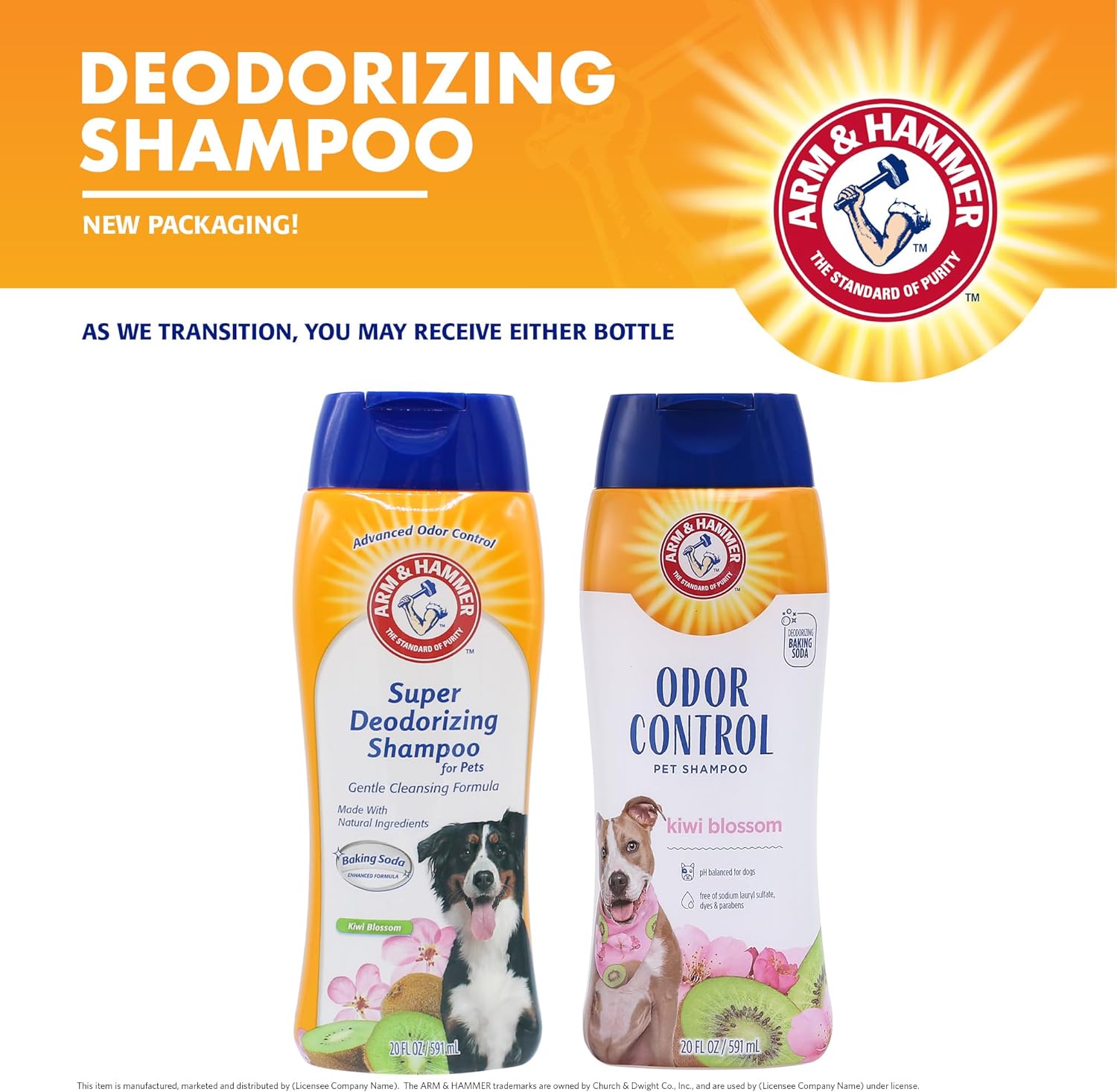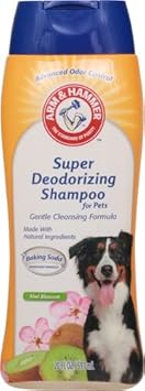 Product Description Bathe your dog with the name you trust. Arm & Hammer uses the power of baking soda to refresh a stinky coat and eliminate odor. The baking soda dissolves into fine particles, getting into hard to reach areas, resulting in a deeper clean. This shampoo will make bath time a pleasant experience for you and your pet and is safe to use with topical flea and tick treatments. Directions ELIMINATES SMELLY ODORS โ Arm & Hammer Super deodorizing shampoo is a pet odor Eliminator, leaving your dog fresh and clean,Arm & Hammer Super Deodorizing Shampoo is a pet odor eliminator that leaves your dog smelling fresh and clean,The shampoo is made with all natural ingredients, resulting in a gentle yet effective formula,Use on wet coat, applying shampoo from the back of ears to tail and rinse, carefully avoiding eyes and ears,Use on wet coat, applying shampoo from the back of ears to tail and rinse, carefully avoiding eyes and ears. Use a washcloth to gently clean the Face. Towel dry thoroughly, and brush out coat when fully dry,This veterinarian recommended formula is specifically pH balanced for dogs, great for pets with sensitive skin, and is paraben free, sulfate free, and hypoallergenic