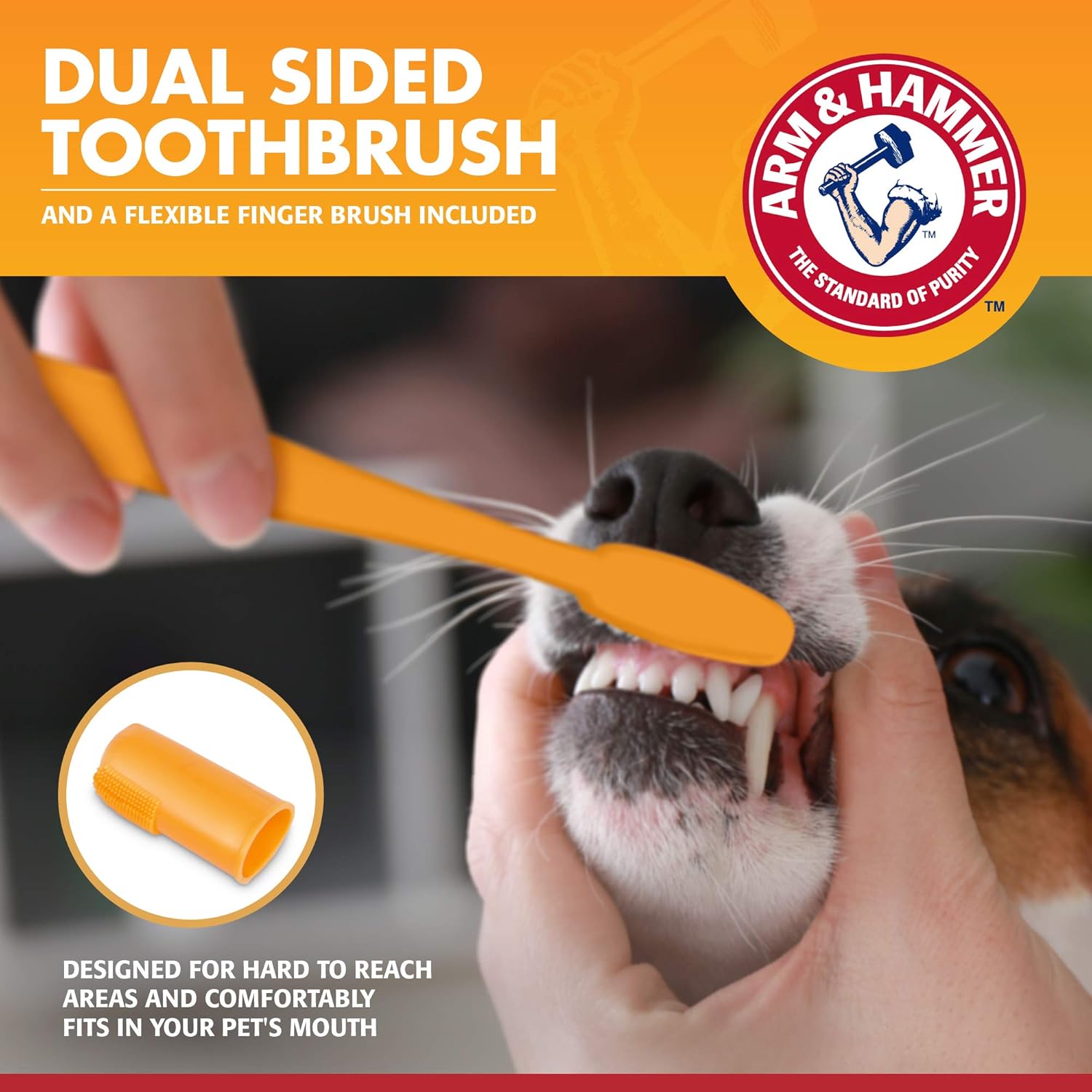 About this item Eliminate bad dog breath with this Dog Toothbrush and toothpaste set so that you can enjoy your dog's kisses without the stinky dog breath! Dog toothbrush set is gentle yet effective in eliminating bad breath, reducing tartar buildup, and whitening and brightening your dog's teeth. Dog tooth paste contains natural ingredients to ensure optimal dental health for your dog with the flavor of a tasty treat he or she will love. Dog toothbrush set comes with a cover so that you can keep your dog's toothbrush protected while you are not using it. Formulated with natural ingredients for Advanced Breath Freshening: See description below for more information. Included Components: Arm & Hammer for Pets Tartar Control Kit for Dogs | Contains Toothpaste › See more product details,Eliminate bad dog breath with this Dog Toothbrush and toothpaste set so that you can enjoy your dog's kisses without the stinky dog breath!,Dog toothbrush set is gentle yet effective in eliminating bad breath, reducing tartar buildup, and whitening and brightening your dog's teeth,Dog tooth paste contains natural ingredients to ensure optimal dental health for your dog with the flavor of a tasty treat he or she will love,Dog toothbrush set comes with a cover so that you can keep your dog's toothbrush protected while you are not using it,Formulated with natural ingredients for Advanced Breath Freshening: See description below for more information,Included Components: Arm & Hammer for Pets Tartar Control Kit for Dogs | Contains Toothpaste