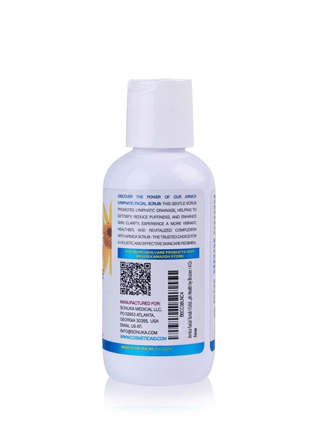About this item Experience the Power of Arnica Montana: Our facial scrub is enriched with the natural wonders of Arnica Montana, known for its soothing and healing properties. Itâs perfect for revitalizing tired, stressed skin and promoting a clear, radiant complexion. Say goodbye to harsh scrubs that irritate your skin. Our gentle formula provides the right balance of exfoliation to remove dead skin cells while maintaining your skin's delicate balance. Ideal for sensitive skin, acne, and blackheads. Natural Lymphatic Drainage Support:This exfoliating face wash is designed to enhance natural lymphatic drainage, helping to detoxify and decongest your skin. Itâs a natural way to support lymph health and reduce puffiness, leaving your skin feeling refreshed and invigorated.Our Arnica Facial Scrub is gentle enough for daily use yet effective enough to deliver noticeable results. Regular use can help manage acne, reduce blackheads, and provide a smooth, even skin tone. Easy to Use: Simply apply a small amount to damp skin, gently massage in a circular motion, and rinse off. Enjoy the feeling of a deep cleanse that doesnât strip your skin of its natural oils. Perfect Size for All Routines: The 4 Oz size is ideal for your bathroom counter and even for travel. Keep your skincare routine consistent wherever you are! Pure and Safe Ingredients: We believe in the power of nature. Our formula is free from harmful chemicals and additives, making it safe for all skin types. Itâs cruelty-free, non-GMO, vegan friendly, and we never test on animals. Trusted Brand: Bruizex is committed to creating products that nurture your skin and promote overall health. With every use, youâre not just cleansing your skin; youâre embracing a holistic approach to skincare. For all skin types. Can be used together with arnica montana gel, cream, ointment, pills, tablets, homeopathic, capsules, supplements, essential oils, pain, bruising and swelling roll on sticks and balms. See more product details,Experience the Power of Arnica Montana: Our facial scrub is enriched with the natural wonders of Arnica Montana, known for its soothing and healing properties. Itâs perfect for revitalizing tired, stressed skin and promoting a clear, radiant complexion. Say goodbye to harsh scrubs that irritate your skin. Our gentle formula provides the right balance of exfoliation to remove dead skin cells while maintaining your skin's delicate balance. Ideal for sensitive skin, acne, and blackheads,Natural Lymphatic Drainage Support:This exfoliating face wash is designed to enhance natural lymphatic drainage, helping to detoxify and decongest your skin. Itâs a natural way to support lymph health and reduce puffiness, leaving your skin feeling refreshed and invigorated.Our Arnica Facial Scrub is gentle enough for daily use yet effective enough to deliver noticeable results. Regular use can help manage acne, reduce blackheads, and provide a smooth, even skin tone,Easy to Use: Simply apply a small amount to damp skin, gently massage in a circular motion, and rinse off. Enjoy the feeling of a deep cleanse that doesnât strip your skin of its natural oils,Perfect Size for All Routines: The 4 Oz size is ideal for your bathroom counter and even for travel. Keep your skincare routine consistent wherever you are!,Pure and Safe Ingredients: We believe in the power of nature. Our formula is free from harmful chemicals and additives, making it safe for all skin types. Itâs cruelty-free, non-GMO, vegan friendly, and we never test on animals. Trusted Brand: Bruizex is committed to creating products that nurture your skin and promote overall health. With every use, youâre not just cleansing your skin; youâre embracing a holistic approach to skincare,For all skin types. Can be used together with arnica montana gel, cream, ointment, pills, tablets, homeopathic, capsules, supplements, essential oils, pain, bruising and swelling roll on sticks and balms