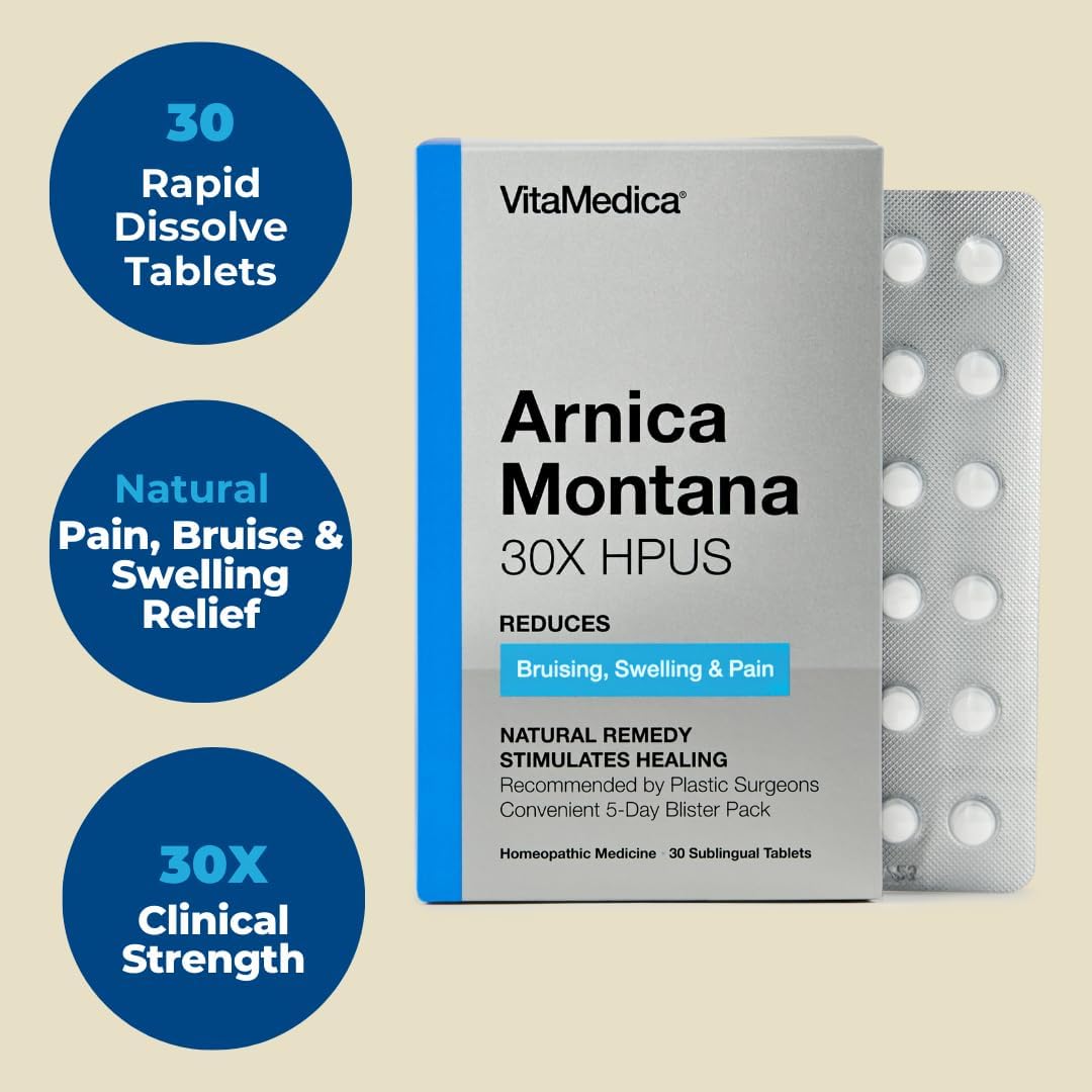 Arnica Montana 30X Hpus, Clinical Grade, Quick Dissolve Tablets, Five-Day Recovery Pack For Pain And Bruise Relief After Surgery Or Injury, Natural Healing, Gentle On The Stomach - 30 Count