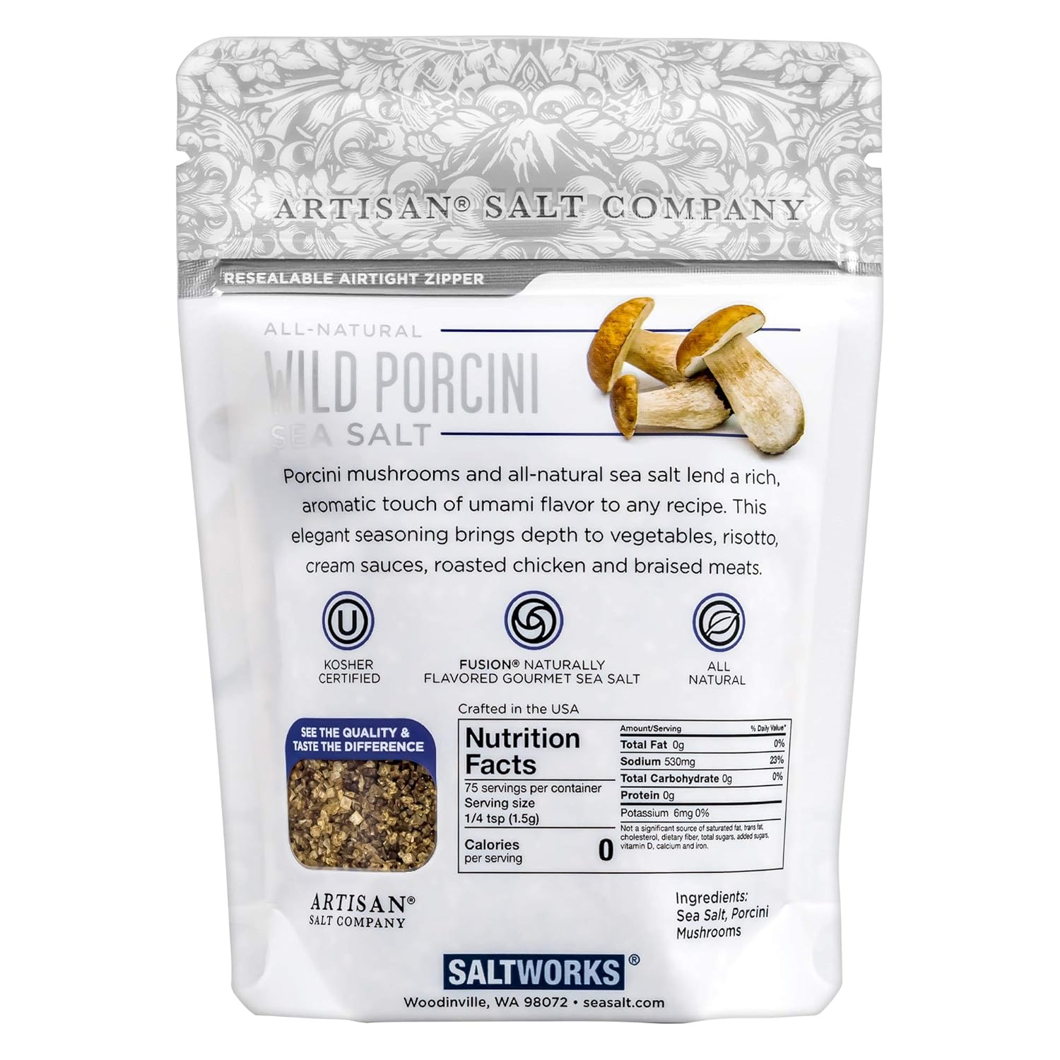 REAL WILD PORCINI MUSHROOMS: Porcini mushrooms and all-natural sea salt combine into an elegant seasoning, ideal for bringing depth to vegetables, cream sauces, roasted chicken and braised meats