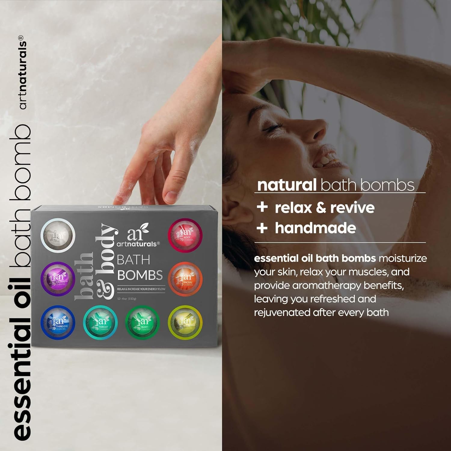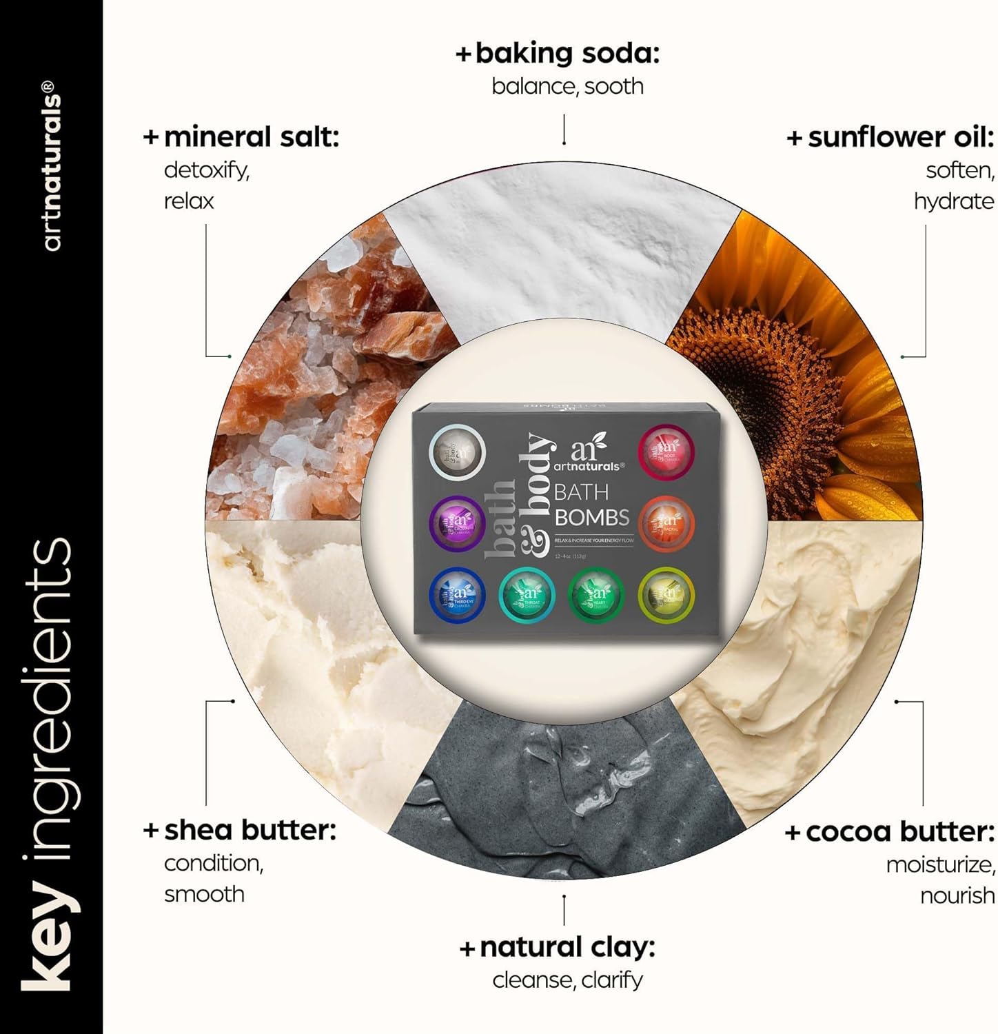 About this item ESSENTIAL OILS These nourishing bath bombs are infused with essential oils for the ultimate spa-like experience. Each bath bomb contains ingredients full of antioxidants that cleanse, detox, and nourish as you soak , providing relief to muscle aches and joint pain. 12 PIECE GIFT SET This specially curated set includes 12 unique scents, each designed to turn bath time into spa time. Each bath bomb is handmade, natural, and free from harsh chemicals and additives. NO CHEMICALS These 12 unique bath bombs use natural clay combined with mineral salts, shea butter, cocoa butter, sunflower seed oil, baking soda, and fragrance to fizz aches and dry skin away. Each bath bomb will give you a soothing and spa-like experience with a natural colorful bath. PERFECT GIFT Presented in delicate gift packaging, artnaturals bath bombs make a wonderful gift for parents, family, or friends, and are ideal for birthdays, weddings, anniversaries, Mother’s Day, Valentine’s Day, and more! See more product details,ESSENTIAL OILS These nourishing bath bombs are infused with essential oils for the ultimate spa-like experience. Each bath bomb contains ingredients full of antioxidants that cleanse, detox, and nourish as you soak , providing relief to muscle aches and joint pain,12 PIECE GIFT SET This specially curated set includes 12 unique scents, each designed to turn bath time into spa time. Each bath bomb is handmade, natural, and free from harsh chemicals and additives,NO CHEMICALS These 12 unique bath bombs use natural clay combined with mineral salts, shea butter, cocoa butter, sunflower seed oil, baking soda, and fragrance to fizz aches and dry skin away. Each bath bomb will give you a soothing and spa-like experience with a natural colorful bath,PERFECT GIFT Presented in delicate gift packaging, artnaturals bath bombs make a wonderful gift for parents, family, or friends, and are ideal for birthdays, weddings, anniversaries, Mother’s Day, Valentine’s Day, and more!