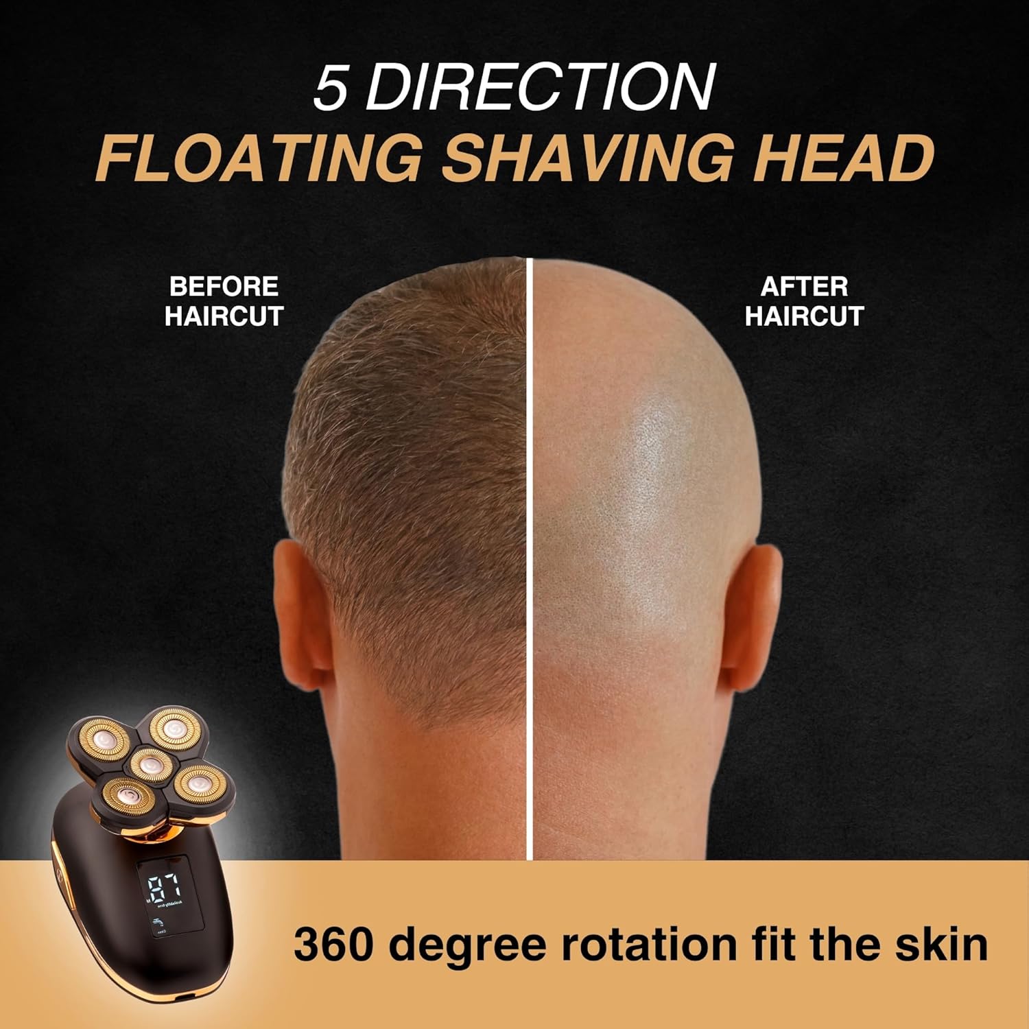 About this item 5 TOOLS IN ONE: Meet all your hair grooming needs with 1 electric shaver that does the job of 5. Great for both men and women, it comes with 5 attachments: a rotating shaver, nose hair trimmer, hair clipper with 3 guide combs, silicone brush, and a facial cleansing brush. GET A CLOSER SHAVE: Looking for a bald head shaver to achieve a classic neat look An electric shaver for women to get legs nice & smooth. The 5D shaver head flexes to complement the curves of your face, neck, or legs. This means an even look youāll love. WET & DRY SHAVING: With shaving cream or without, in the bathroom or over the sink, this IPX5 water-resistance electric shaver bends to your every whim. It is also fully washable for fuss-free cleaning. Just rinse it under the skin, leave it out to dry, and experience the convenience. CORDLESS DESIGN: This multi-purpose cordless trimmer treats you to 90 minutes of wireless hair removal and features an LED display for easy battery monitoring. A full charge takes just 2 hours via USB, and you can use your laptop, power bank, car charger, or AC wall adapter. MADE TO LAST: Weāve combined a waterproof design with German-imported blades to create an electric trimmer for women and men of impressive durability. Whether you shave in the shower or take it on your trips, this little multi-purpose marvel withstands it all. See more product details,5 TOOLS IN ONE: Meet all your hair grooming needs with 1 electric shaver that does the job of 5. Great for both men and women, it comes with 5 attachments: a rotating shaver, nose hair trimmer, hair clipper with 3 guide combs, silicone brush, and a facial cleansing brush,GET A CLOSER SHAVE: Looking for a bald head shaver to achieve a classic neat look An electric shaver for women to get legs nice & smooth. The 5D shaver head flexes to complement the curves of your face, neck, or legs. This means an even look youāll love,WET & DRY SHAVING: With shaving cream or without, in the bathroom or over the sink, this IPX5 water-resistance electric shaver bends to your every whim. It is also fully washable for fuss-free cleaning. Just rinse it under the skin, leave it out to dry, and experience the convenience,CORDLESS DESIGN: This multi-purpose cordless trimmer treats you to 90 minutes of wireless hair removal and features an LED display for easy battery monitoring. A full charge takes just 2 hours via USB, and you can use your laptop, power bank, car charger, or AC wall adapter,MADE TO LAST: Weāve combined a waterproof design with German-imported blades to create an electric trimmer for women and men of impressive durability. Whether you shave in the shower or take it on your trips, this little multi-purpose marvel withstands it all