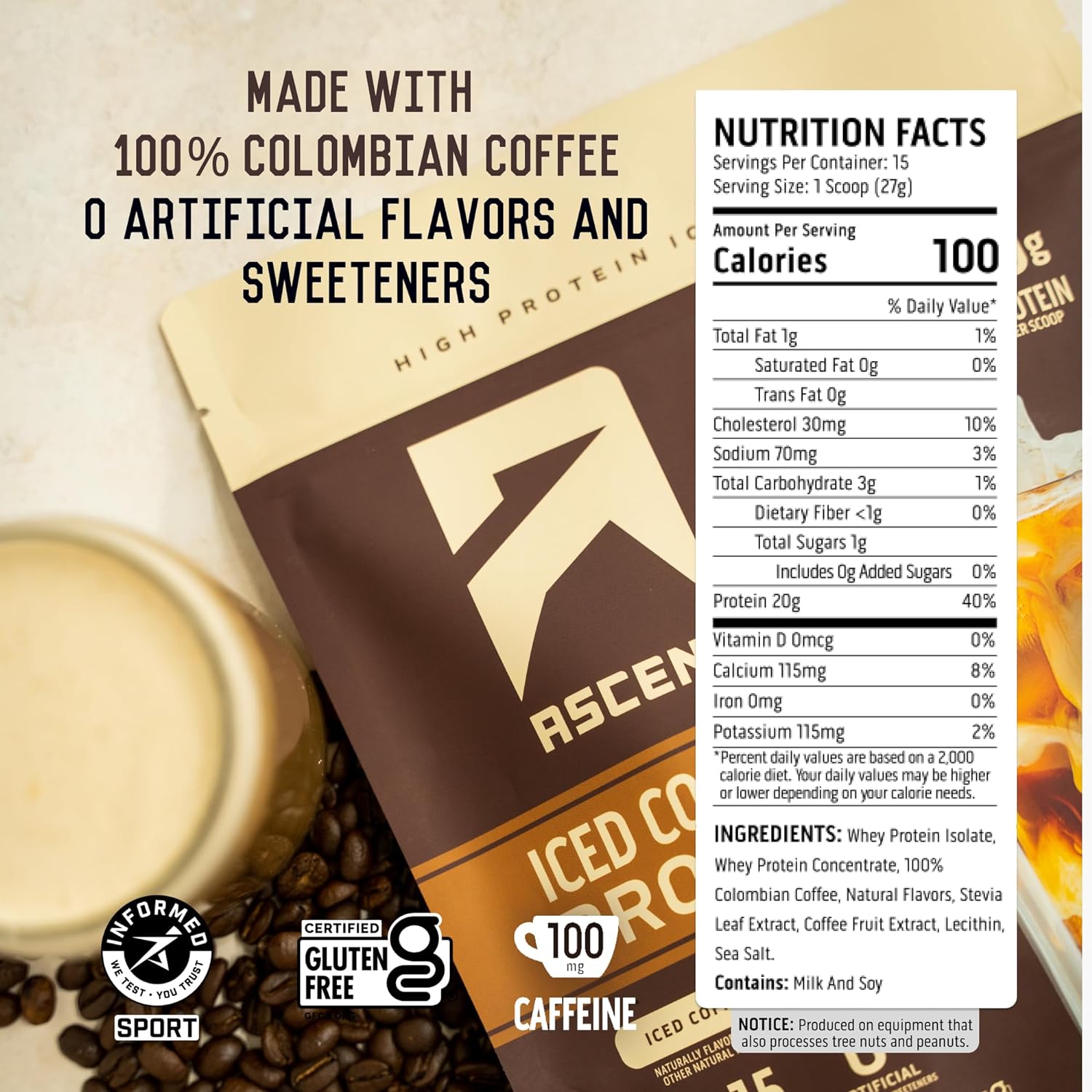 Ascent Iced Coffee Protein Powder - High Protein Coffee Powder, 20 G Protein & 100 Mg Caffeine - 30 Servings
