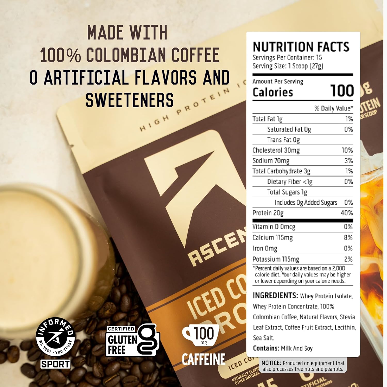 About this item Iced Coffee Plus Protein - Enjoy the perfect blend of 100 mg of caffeine and 20 grams of clean whey protein per serving. Delicious and Flavorful - Indulge in a protein coffee powder that offers a fantastic taste while helping you meet your daily protein needs. Power Through Your Day - Kickstart your mornings, enhance your workouts, or stay energized in the afternoon with this protein coffee powder. Choose Your Caffeine Intensity - Increase your caffeine & protein needs by following Ascent's intensity guide for up to 150 mg of caffeine per serving. Clean and Natural - Ascent High Protein Iced Coffee is made with 100% Colombian coffee and Coffeeberry Energy for a natural caffeine source. It contains no artificial flavors, sweeteners, or added sugar. See more product details,Iced Coffee Plus Protein - Enjoy the perfect blend of 100 mg of caffeine and 20 grams of clean whey protein per serving,Delicious and Flavorful - Indulge in a protein coffee powder that offers a fantastic taste while helping you meet your daily protein needs,Power Through Your Day - Kickstart your mornings, enhance your workouts, or stay energized in the afternoon with this protein coffee powder,Choose Your Caffeine Intensity - Increase your caffeine & protein needs by following Ascent's intensity guide for up to 150 mg of caffeine per serving,Clean and Natural - Ascent High Protein Iced Coffee is made with 100% Colombian coffee and Coffeeberry Energy for a natural caffeine source. It contains no artificial flavors, sweeteners, or added sugar
