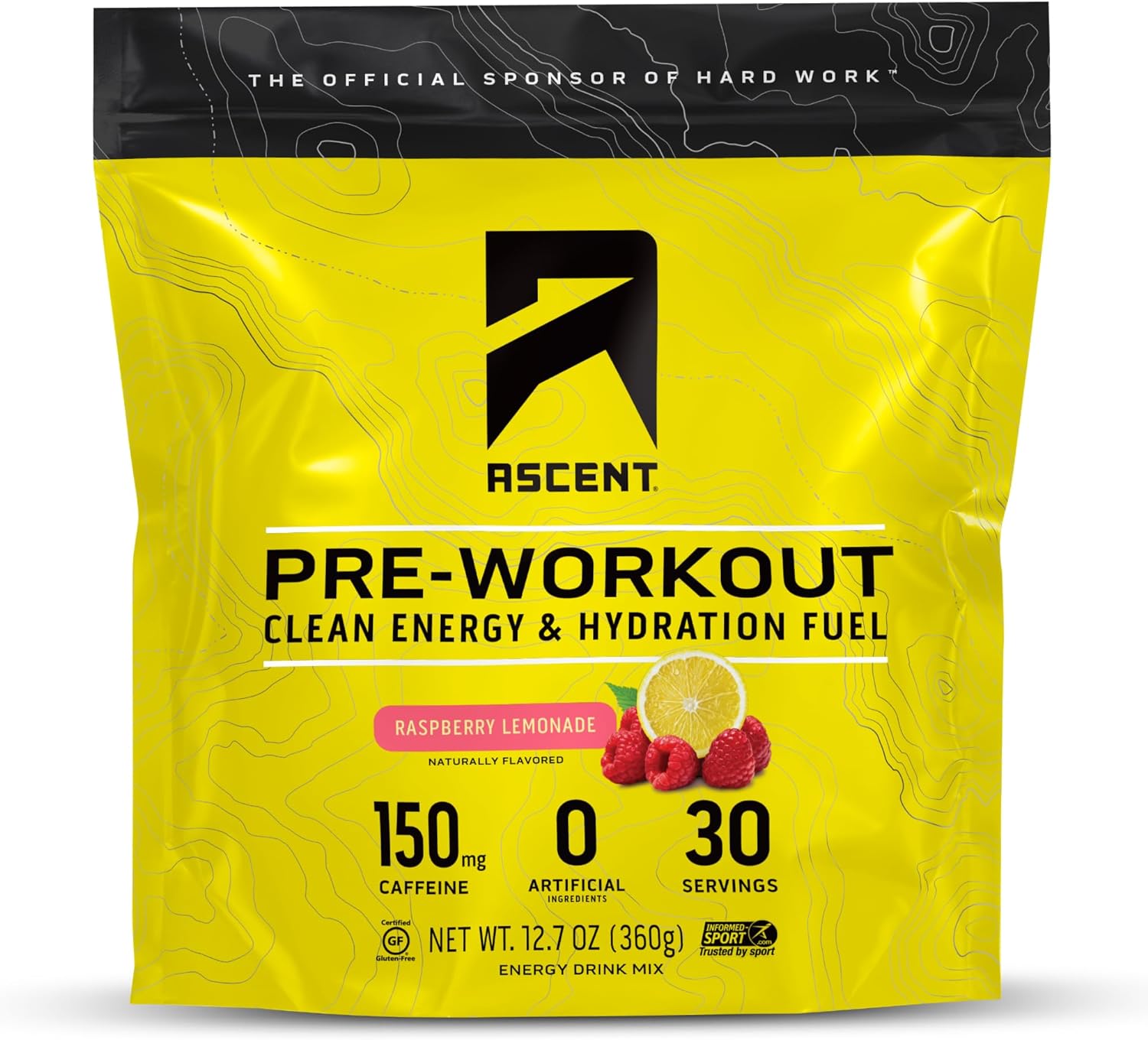 Ascent Pre Workout Powder - Preworkout For Men & Women With No Artificial Ingredients Or Flavors - Clean Energy With 150G Caffeine & 250G Electrolytes - Raspberry Lemonade, 30 Servings