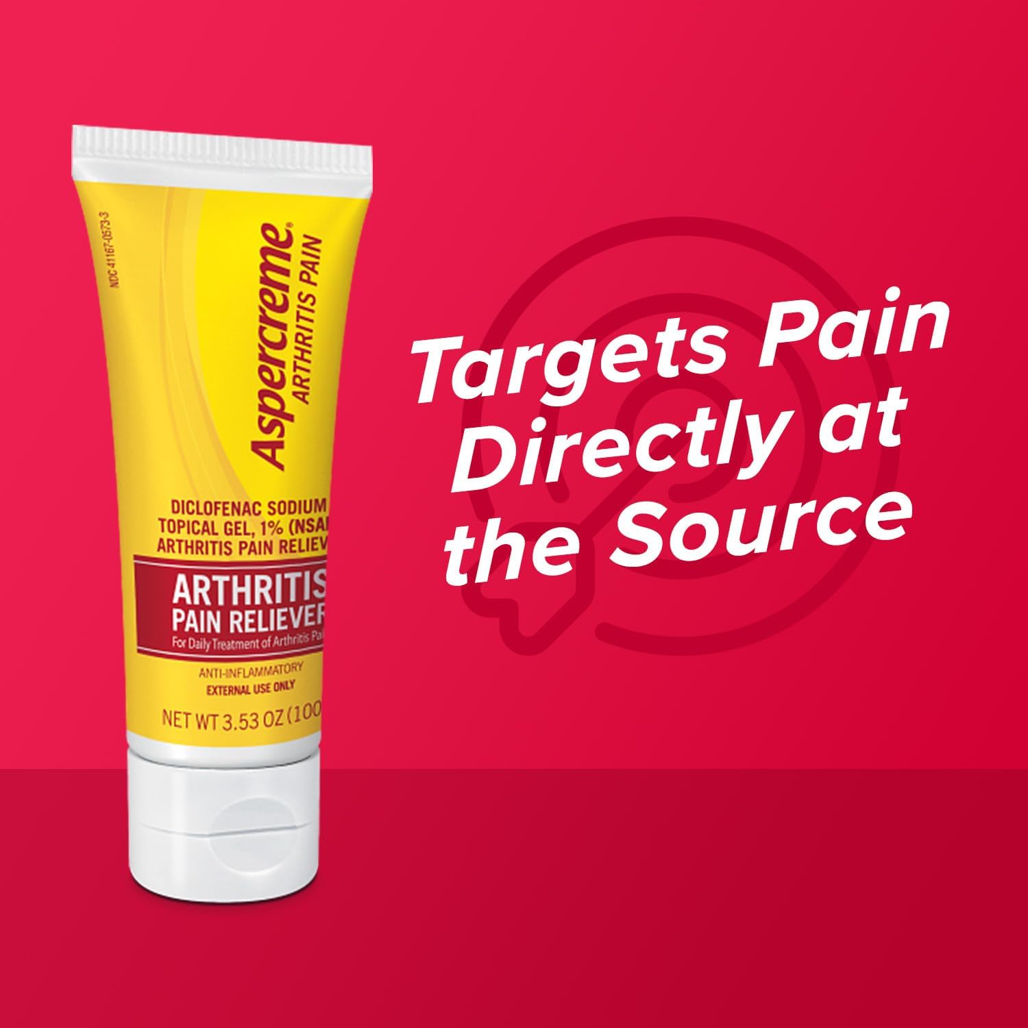 Contains one (1) 100-gram tube of Aspercreme Arthritis Pain Relief GelAspercreme Arthritis Pain Relief Gel is clinically proven to relieve joint pain and improve mobilityFull prescription strength over-the-counter topical NSAID treatment for arthritis joint painUnlike pills,** Aspercreme Arthritis is applied directly to the joint to relieve arthritis pain **Refers to diclofenac sodium 50-mg enteric-coated tablets taken orally 3 times dailyThis Aspercreme gel contains diclofenac, an effective medicine that's clinically proven to relieve arthritis painRelieve arthritis at the source of pain with Aspercreme Arthritis Pain Relieving Gel. This medicated topical gel provides long-lasting relief from arthritis and joint pain* in up to two joints at the same time, including hands, wrists, elbows, feet, ankles and knees. The prescription-strength formula contains diclofenac sodium 1%, a clinically-proven nonsteroidal anti-inflammatory medicine that relieves arthritis joint pain, reduces stiffness, and improves mobility. Unlike pills,** Aspercreme Arthritis is applied directly to the joint to give you relief from your arthritis joint pain. It's an effective alternative to OTC oral analgesics. Keep a tube of Aspercreme Arthritis Pain Relief Gel in your medicine cabinet, purse or gym bag so you always have powerful arthritis pain relief on hand. *When applied 4 times a day. It might take up to 7 days to relieve arthritis pain. **Refers to diclofenac sodium 50-mg enteric-coated tablets taken orally 3 times daily