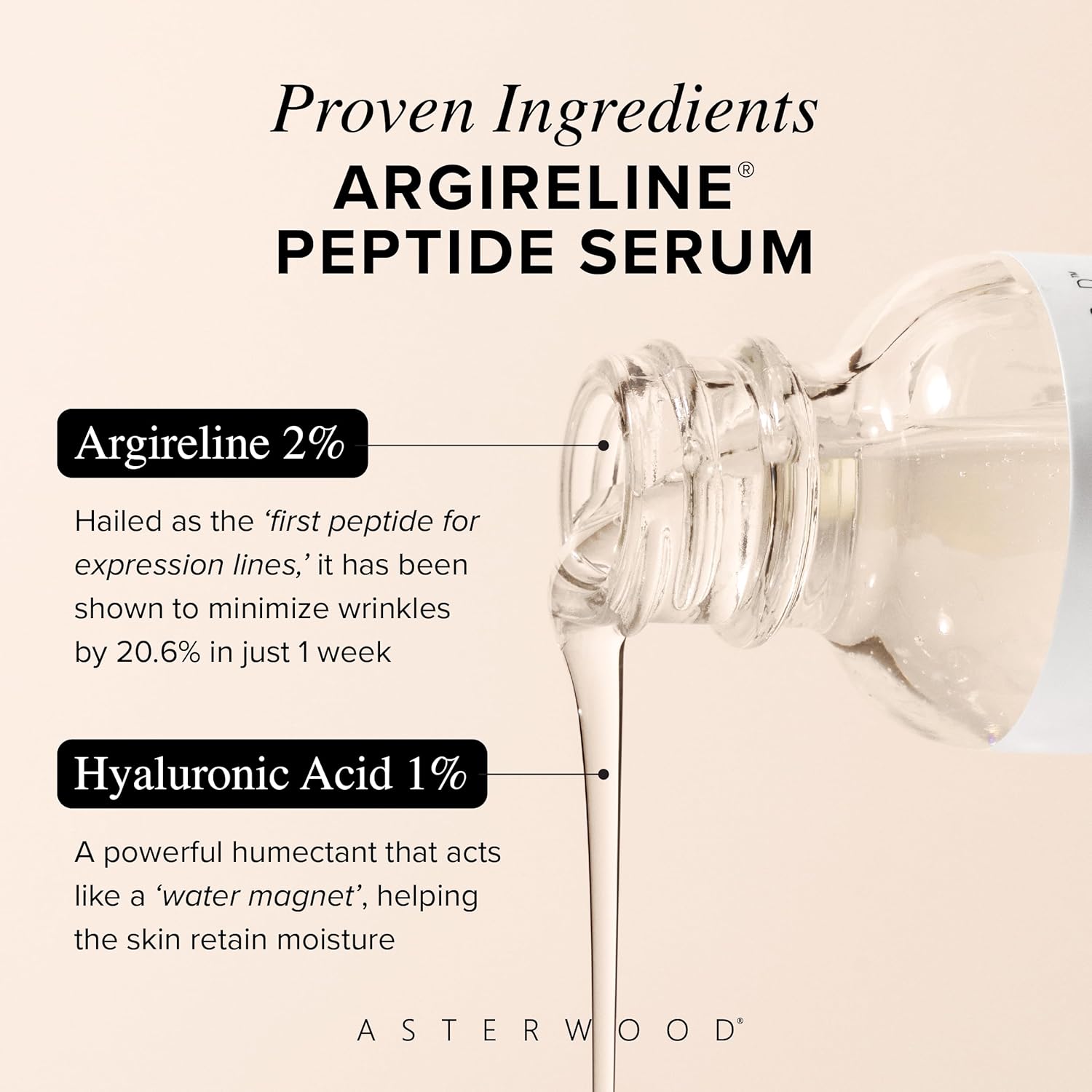 About this item Smooth and Tight Skin: Asterwood Argireline Peptide with Hyaluronic Acid serum for face helps smooth wrinkles and improve elasticity. The Argireline peptides work by targeting a key mechanism in wrinkle formation, while hyaluronic acid keeps skin hydrated. Youthful and Glowing Complexion: The youthful and glowing skin you've always wanted is finally here. Our hydrating base of pure Hyaluronic Acid evens skin tone for a more radiant complexion, which keeps you feeling young. No Harmful Ingredients: Our peptide serum is free of fragrance, parabens, oils, and sulfates to avoid irritating your skin or causing unwanted breakouts. It's made in the USA and safe to use with Vitamin C serum, retinol, face cream, and face oils. Perfect Gift for Your Loved Ones: This anti-aging peptide serum makes a great gift for moms, sisters and girlfriends. Its convenient size makes it perfect for traveling too. Safe for All Skin Types: Our potent ingredients are safe and well-balanced to avoid irritation. For best results, use this face serum on cleansed skin as a part of your nighttime skincare routine right before moisturizing. See more product details,Smooth and Tight Skin: Asterwood Argireline Peptide with Hyaluronic Acid serum for face helps smooth wrinkles and improve elasticity. The Argireline peptides work by targeting a key mechanism in wrinkle formation, while hyaluronic acid keeps skin hydrated,Youthful and Glowing Complexion: The youthful and glowing skin you've always wanted is finally here. Our hydrating base of pure Hyaluronic Acid evens skin tone for a more radiant complexion, which keeps you feeling young,No Harmful Ingredients: Our peptide serum is free of fragrance, parabens, oils, and sulfates to avoid irritating your skin or causing unwanted breakouts. It's made in the USA and safe to use with Vitamin C serum, retinol, face cream, and face oils,Perfect Gift for Your Loved Ones: This anti-aging peptide serum makes a great gift for moms, sisters and girlfriends. Its convenient size makes it perfect for traveling too,Safe for All Skin Types: Our potent ingredients are safe and well-balanced to avoid irritation. For best results, use this face serum on cleansed skin as a part of your nighttime skincare routine right before moisturizing