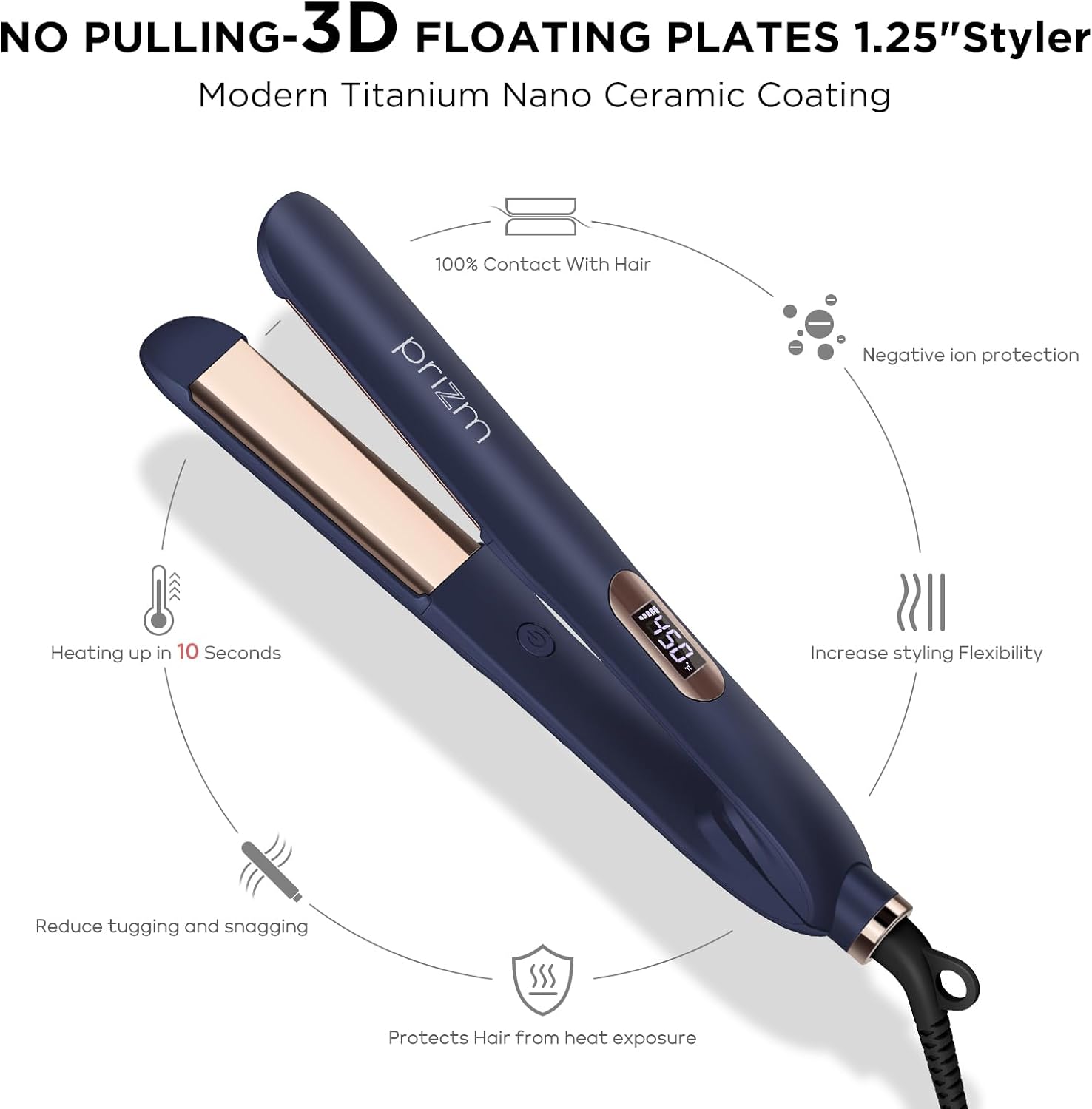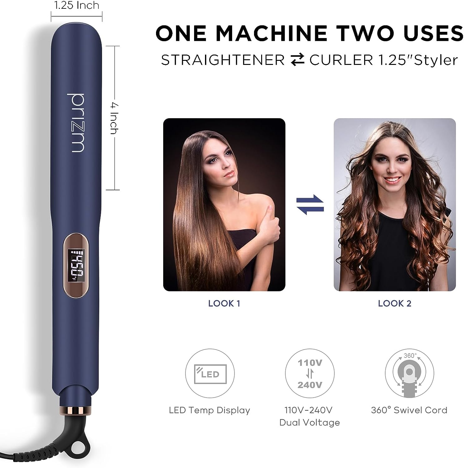 ABOUT THE PRODUCT: 1 > Less Thermal Damage & Works good on Thick Hair The Prizm 1.25 inch hair straightener is specifically designed for different hair. Its Nano Titanium coating helps protect your hair from heat damage, providing care for your hair and reducing hair split ends. By utilizing negative ion technology, it effectively achieves improved hair shiny and frizz results by automatically and evenly adjusting the intensity based on the amount of hair being treated 2 > Fast Heat Up & Adjustable TemperatureThe flat iron heats up in 10 seconds with a temperature range from 330°F to 450°F, saving your time on styling and offering you with total control to choose the optimum temperature for your hair type 3 > 3D Floating Titanium Plates & PTC Heating3D floating NANO titanium Plates can reduce tugging and snagging hair, making the hair slide smoothly in the splint; In order to protect hair from overmuch heat exposure, flat iron adopts titanium plate with PTC fast heating technology, which can effectively prevent Thermal Damage hair and make the styling effect betterFlat Iron Hair Straightener, Prizm Hair Straightener and Curler 2 in 1, 1.25'' inch Straightener Flat Iron with 4 Temp, Dual Voltage, LCD Temp Display, Nano Titanium Flat Iron for Fast Heating
