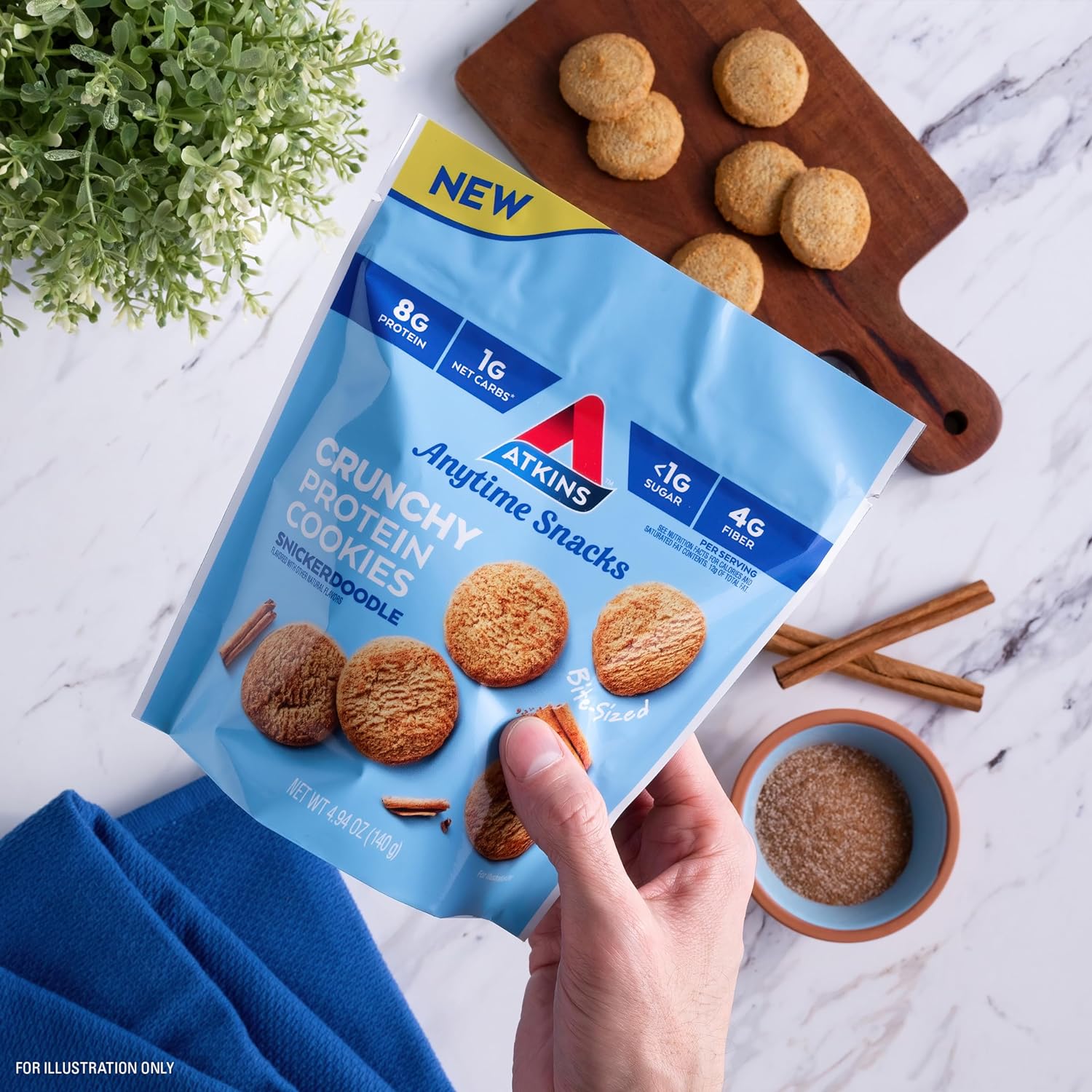 ON-THE-GO. Atkins Snickerdoodle Crunchy Protein Cookies. Enjoy delicious cookies that fit right into your busy schedule, no matter where you go, with 8g of protein, 1g of net carbs, and <1g of sugar per servingSNACK WITH PURPOSE. Enjoy everything you love about a cookie and everything you want in a snack without all the sugar, with 8g of protein, 1g of net carbs, and <1g of sugar per servingCRISPITY, CRUNCHITY. Taste the big, scrumptious crunch that bombards your taste buds with decadent flavor and textureUNBELIEVABLY DELICIOUS. Every crunchy, crispy bite is filled with the rich taste of snickerdoodle to satisfy your sweet toothOffered in 3pk cartons containing 4.94 oz cookies. About 5 servings per container with 6 cookies per serving