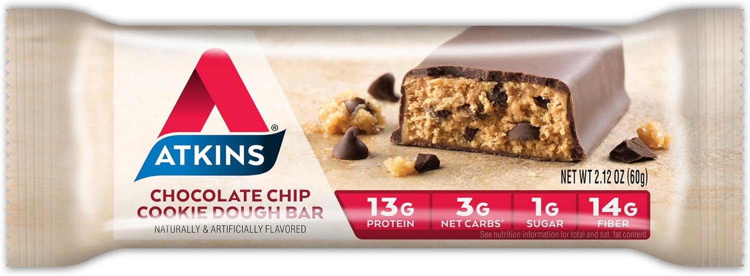 Atkins⢠Chocolate Chip Cookie Dough Flavored Protein Meal Bars Are Where Great Tastes Come Together In A Chewy And Tempting Bar. This Low Sugar* Protein Bar Is The Perfect Choice For When YouāRe On The Go, Short On Time, Or Just Want The Satisfaction Of A Chewy Meal Bar With The Taste Of Chocolate Chip Cookie Dough. These Delicious Bars Are High In Fiber* And Have 13G Of Protein, 1G Of Sugar, And 3G Of Net Carbs Per Serving