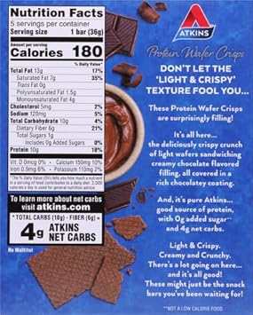 Atkins™ Chocolate Crème flavored Protein Wafer Crisps bring together the satisfying crunch of a light and crispy wafer and a creamy filling of decadent chocolatey crème flavor. This low sugar*, low carb* wafer crisp is the perfect choice for when you’re on the go, short on time, or just want the crunch of a wafer with the delicious taste of chocolatey crème. These keto friendly* wafer crisps are rich in fiber* and have 10g of protein, 4g of net carbs, and 1g of sugar per serving,AT HOME OR ON-THE-GO. Atkins Chocolate Crème Protein Wafer Crisps. Enjoy delicious wafer crisps that fit right into your busy schedule, with 10g of protein, 4g of net carbs, and 1g of sugar per serving*. This is Today’s Atkins,YOUR APPROACH. Help give your body the nutrients it needs without sacrificing your favorite flavors,AMAZING RECIPES. Delight in the nutrients and satisfying flavors of great foods made with quality ingredients,Offered in 5ct cartons containing individually wrapped 1.27oz wafer crisps,TASTE WHAT’S GOOD. Stay true to your low carb lifestyle with these delicious treats