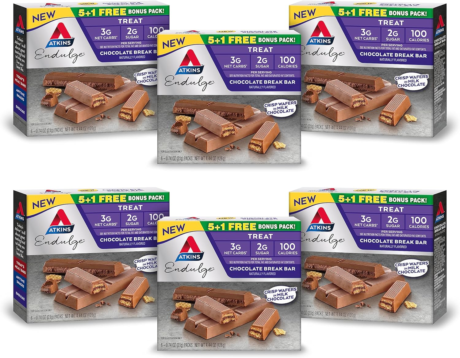 Atkins Endulge Treat, Chocolate Break Bar, 3G Net Carbs, 2G Sugar, 100 Calories, 6 Packs (6 Bars Each)