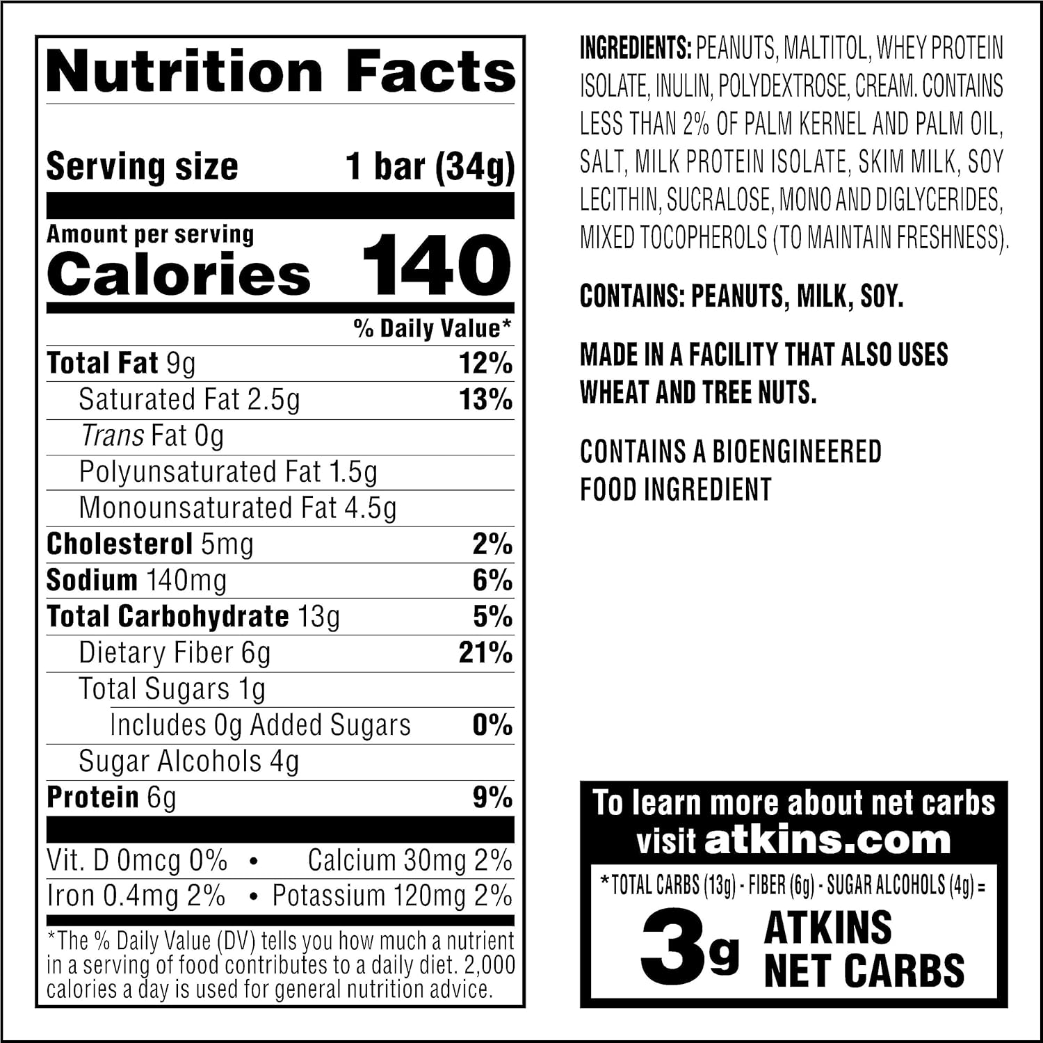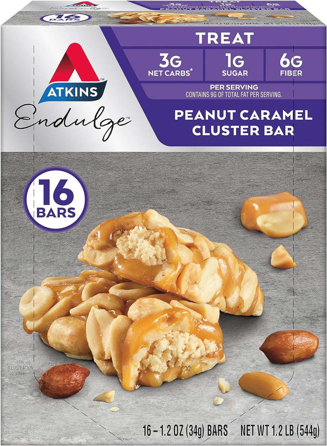 The Atkins Mission. Atkinsā Purpose Is To Improve Global Health And To Help People Understand That Eating Right Is About Both Losing Weight And Becoming Healthy. ThatāS Done Through The Use Of Imagination, Innovation, Partnerships And Commitment To Science To Make It Easy To Eat Right. Peanut Caramel Cluster Bar. Atkins' Treats Help Support Your Low Carb Lifestyle Without Compromising Flavor. This Bar Delivers All The Taste You Crave With None Of The Guilt. So The Next Time You Need Some Sweetness, Reach For This Scrumptious Combination Of Rich Nougat, Creamy Caramel And Savory Peanuts. WhatāS Inside. Let This Keto-Friendly* Treat Delight Your Taste Buds While Keeping Your Lifestyle On Track. Includes 1 Pack Of 16 Individually Wrapped 1.2 Oz Bars With 6 Grams Of Protein, 6 Grams Of Fiber, 3 Grams Of Net Carbs And 1 Gram Of Sugar Per Serving.*When Used With Atkins Ketogenic Programs Eat Right. Not Less. Cardiologist Dr. Robert C. Atkins Saw That Eating Right, Not Less, Improved His Patientsā Health - Not Just In Terms Of Weight Loss But Also Reducing Chronic Issues. Over The Last 45 Years, Mounting Evidence Is Revealing That Dr. Atkins Was Right. Public Health Advocacy. The āAtkins Dietā Started As A Fad, But Quickly Became A Counter-Conventional Movement That Reset PeopleāS Understanding Of Nutrition And Weight Loss, And Its Link To Health. Atkins Public Health Advocacy Has Played A Significant Role In Updating Dietary Guidelines, Moving Them From Less And Towards Right