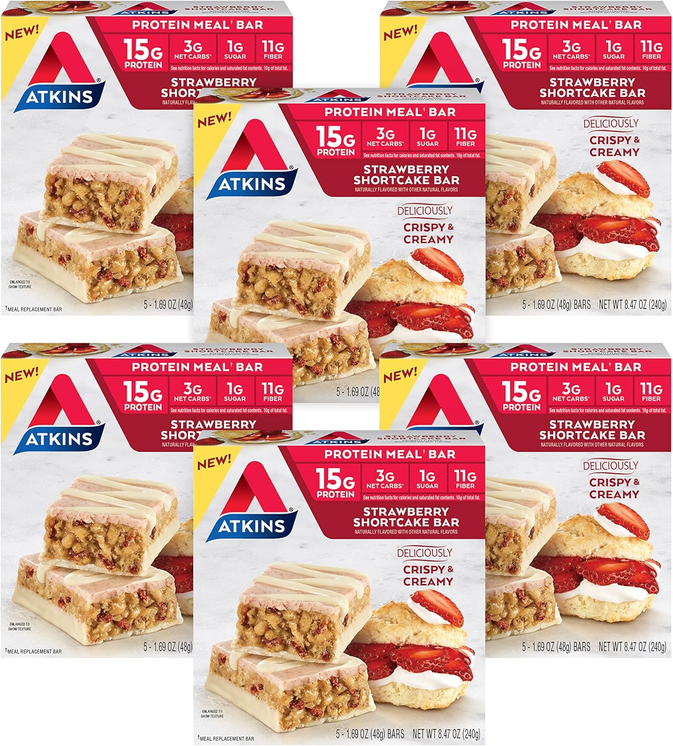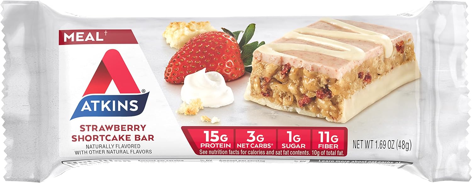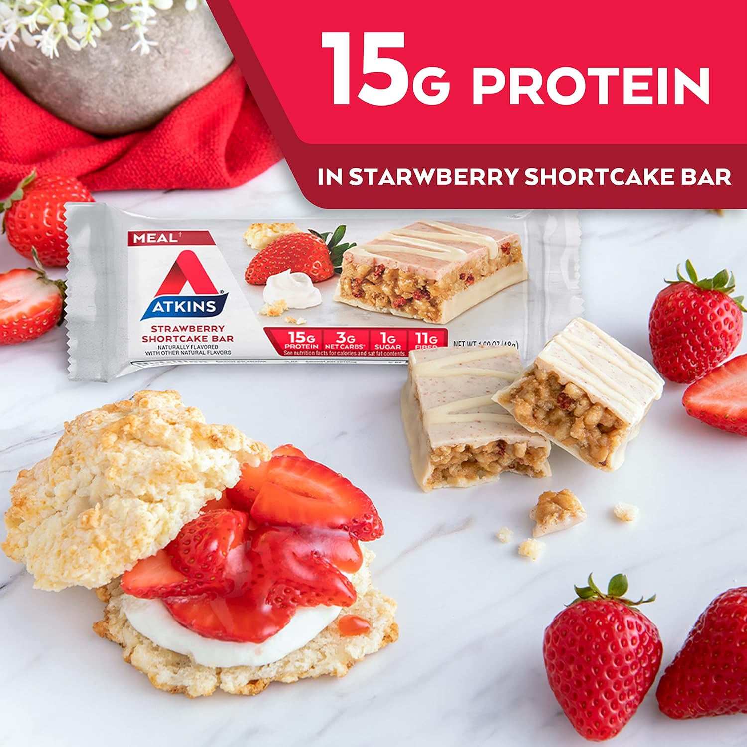 At Home Or On-The-Go. Atkins Strawberry Shortcake Protein Meal Bars. Enjoy Delicious Meal Bars That Fit Right Into Your Busy Schedule, With 15G Of Protein, 1G Of Sugar, And 3G Of Net Carbs Per Serving*. This Is Today’S Atkins