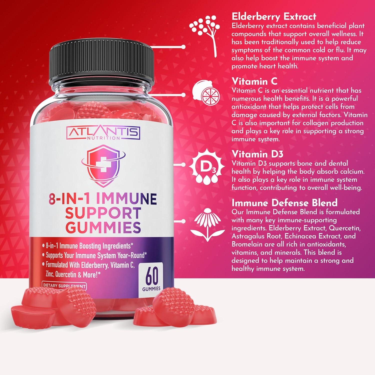 Atlantis Nutrition 8-In-1 Immune Support Gummies With Elderberry | Immune Supplement With Elderberry, Quercetin, Zinc, Vitamin C - Immunity Boosters For Adults & Kids - Delicious Flavor - 60 Count