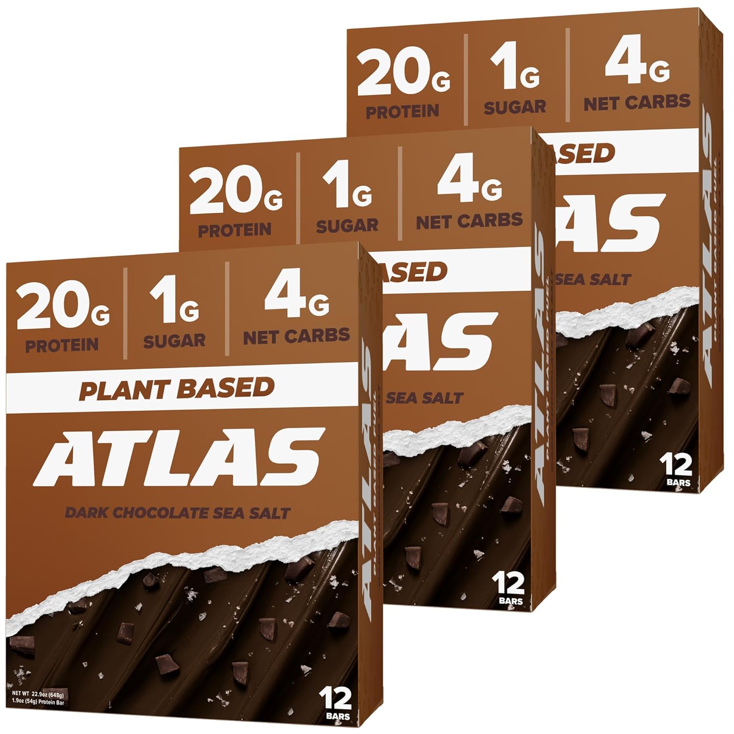 Atlas Protein Bar, 20G Plant Protein, 1G Sugar, Clean Ingredients, Gluten Free Dark Chocolate Sea Salt, 12 Count (Pack Of 3))