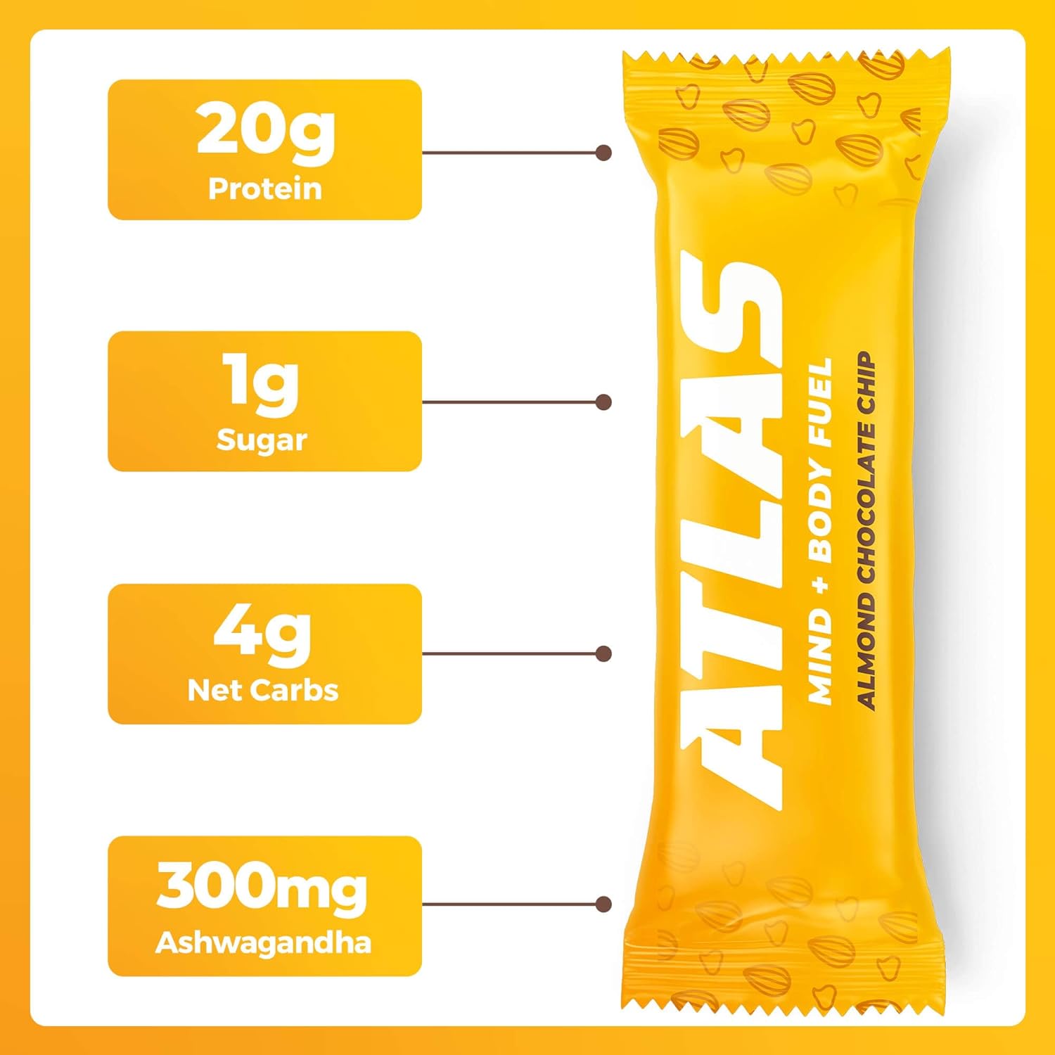 Atlas Protein Bar, 20G Protein, 1G Sugar, Clean Ingredients, Gluten Free (Almond Chocolate Chip, 12 Count (Pack Of 1))