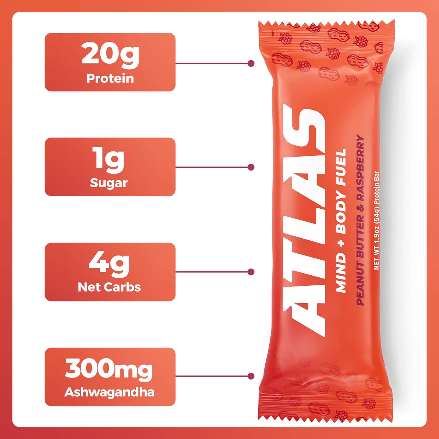 Atlas Protein Bar, 20G Protein, 1G Sugar, Clean Ingredients, Gluten Free (Peanut Butter Raspberry, 12 Count (Pack Of 1))