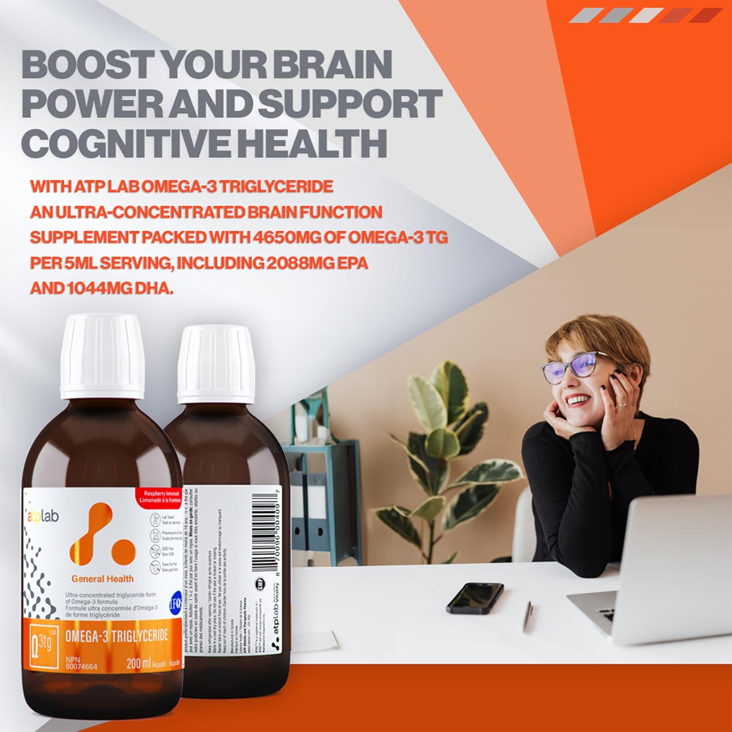 ATP Lab Omega-3 Triglyceride is one of the best Ultra-concentrated triglyceride forms of Omega-3 formula currently on the market. Ultra-concentrated triglyceride form of Omega-3 formula 4650 mg of Omega-3 TG per 5ml. Ultra-concentrated triglyceride form of Omega-3 formula 4650 mg of Omega-3 TG per 5ml * (2088 mg EPA, 1044 mg DHA)