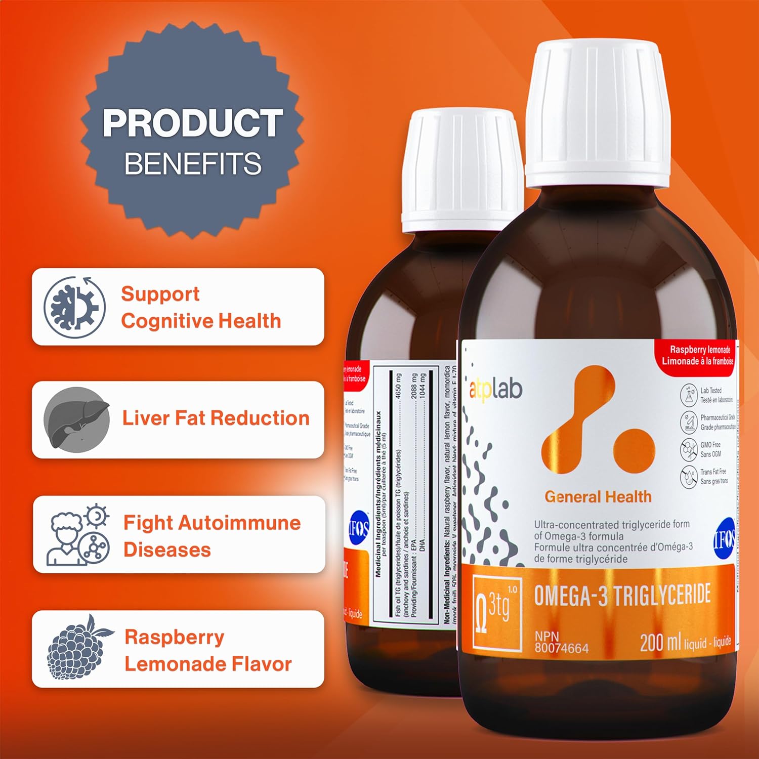 About this item ATP LAB | Omega-3 Triglyceride 200 ml | Ultra-concentrated triglyceride form of Omega-3 formula 4650 mg of Omega-3 TG per 5ml * (2088 mg EPA, 1044 mg DHA). Stay consistent with your supplement routine thanks to the high concentration of EPA and DHA in ATP Lab Omega-3 Triglyceride. ATP Lab Omega-3 Triglyceride is one of the best Ultra-concentrated triglyceride forms of Omega-3 formula currently on the market. Ultra-concentrated triglyceride form of Omega-3 formula 4650 mg of Omega-3 TG per 5ml. Ultra-concentrated triglyceride form of Omega-3 formula 4650 mg of Omega-3 TG per 5ml * (2088 mg EPA, 1044 mg DHA) Enjoy the taste and convenience of ATP Lab Omega-3 Triglyceride, a high-quality omega-3 supplement packed with 2088 mg of EPA and 1044 mg of DHA per 5ml serving. This ultra-concentrated triglyceride form of Omega-3 formula is a convenient and easy way to support your daily omega-3 needs. Its liquid form and delicious flavors of Green Apple and Raspberry Lemonade make it a perfect choice for those looking to supplement their diet with Omega-3. ATP Lab Omega-3 Triglyceride is a premium fish oil supplement that can help you maintain a healthy and balanced diet. Its liquid form allows for easy dosing, and the high concentration of EPA and DHA make it a great choice for those looking to support their overall wellness. The triglyceride form of Omega-3 in this supplement also supports better absorption, ensuring you get the most out of your Omega-3 intake. Make ATP Lab Omega-3 Triglyceride a part of your daily routine to support your overall well-being. Whether you're looking to improve your Omega-3 intake or simply enjoy the taste of this delicious supplement, you won't be disappointed. Try it today and experience the benefits of this high-quality Omega-3 supplement. › See more product details,ATP LAB | Omega-3 Triglyceride 200 ml | Ultra-concentrated triglyceride form of Omega-3 formula 4650 mg of Omega-3 TG per 5ml * (2088 mg EPA, 1044 mg DHA). Stay consistent with your supplement routine thanks to the high concentration of EPA and DHA in ATP Lab Omega-3 Triglyceride,ATP Lab Omega-3 Triglyceride is one of the best Ultra-concentrated triglyceride forms of Omega-3 formula currently on the market. Ultra-concentrated triglyceride form of Omega-3 formula 4650 mg of Omega-3 TG per 5ml. Ultra-concentrated triglyceride form of Omega-3 formula 4650 mg of Omega-3 TG per 5ml * (2088 mg EPA, 1044 mg DHA),Enjoy the taste and convenience of ATP Lab Omega-3 Triglyceride, a high-quality omega-3 supplement packed with 2088 mg of EPA and 1044 mg of DHA per 5ml serving. This ultra-concentrated triglyceride form of Omega-3 formula is a convenient and easy way to support your daily omega-3 needs. Its liquid form and delicious flavors of Green Apple and Raspberry Lemonade make it a perfect choice for those looking to supplement their diet with Omega-3,ATP Lab Omega-3 Triglyceride is a premium fish oil supplement that can help you maintain a healthy and balanced diet. Its liquid form allows for easy dosing, and the high concentration of EPA and DHA make it a great choice for those looking to support their overall wellness. The triglyceride form of Omega-3 in this supplement also supports better absorption, ensuring you get the most out of your Omega-3 intake,Make ATP Lab Omega-3 Triglyceride a part of your daily routine to support your overall well-being. Whether you're looking to improve your Omega-3 intake or simply enjoy the taste of this delicious supplement, you won't be disappointed. Try it today and experience the benefits of this high-quality Omega-3 supplement