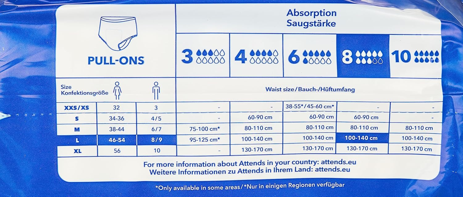Product Description Attends Incontinence Pull-Ons are a range of highly absorbent pants suitable for reduced bladder and/or bowel sphincter control and where incontinence can occur without the client being aware. Protects against the loss of urine and sometimes also faeces, several times during the day and night. Can easily be pulled up and down by the client or the caregiver. Capable of managing both urinary and faecal incontinence. The pants are white for discretion. Due to their flexible shape with asymmetric leg-cut, Attends Pull-Ons give the feeling of normal underwear. Directions 1. Remove the protector from its packaging. 2. Ensure a secure fit by pulling the protector up like normal underwear. 3. Dispose of the protector hygienically when necessary. P.when('A').execute(function(A) { A.on('a:expander:toggle_description:toggle:collapse', function(data) { window.scroll(0, data.expander.$expander[0].offsetTop-100); }); }); Safety Warning Ensure a snug fit, dispose of used protectors promptly and hygienically, and discontinue use if skin irritation or allergic reactions occur. Manufacturer Contact Information info@flemingmedical.ie See more,Attends Pull-Ons have a highly absorbent core and anti-leakage barrier,Urine is kept away from the skin and the odour protection core locks unpleasant smells inside the product,The cloth-like back sheet of Attends Pull-Ons is made of soft, breathable material, which contributes to healthy skin,Absorption: 2440g,Hip measurement: 100cm-140cm