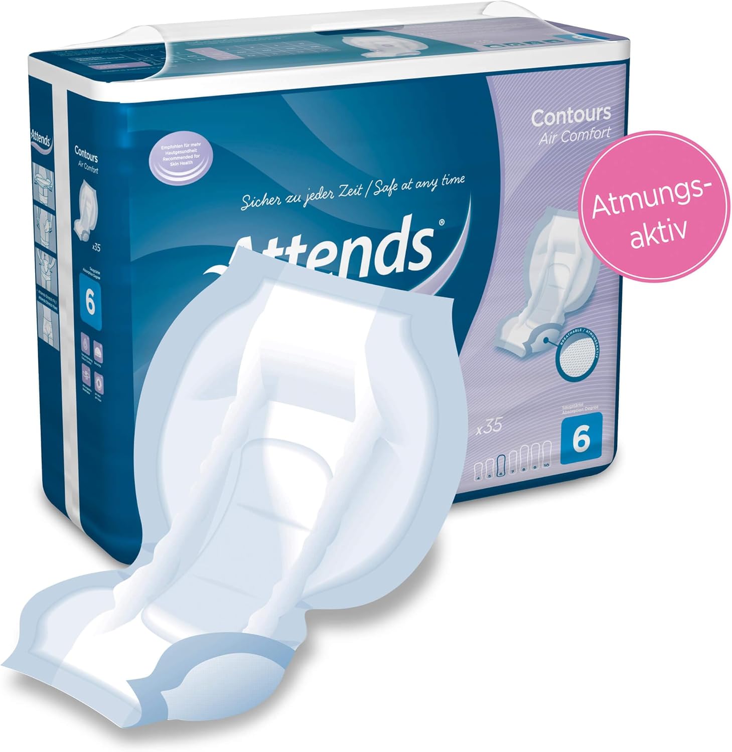 Product description Anatomically shaped incontinence pads for moderate bladder weakness. Product features: Attends Contours Air Comfort 6 (suction strength 6) are anatomically shaped templates. For medium urinary incontinence. With complete bubble emptying, strong urination, and support toilet training. The Attends Quick-Dry technology stands for superior skin dryness: the powerful super absorber securely locks large amounts of fluid inside the template. Attends Odour Protection prevents the emergence of unpleasant odours. With additional side leakage protection for safety even when lying down. The breathable exterior ensures a pleasant and healthy skin feeling without sweating. Wear with Attends Stretch Pants fixing trousers. Wet indicator shows the change time. Length:58cm/22.8" Latex free. Source: Manufacturer's Details As of 06/2015 Directions Wear with Attends Stretch Pants fixing trousers for proper application. Change when the wet indicator shows, typically every 4-6 hours or after each use. Consider the product's length of 58cm/22.8 inches for a proper fit. The product features Attends Odour Protection and a breathable exterior for user comfort and hygiene. P.when('A').execute(function(A) { A.on('a:expander:toggle_description:toggle:collapse', function(data) { window.scroll(0, data.expander.$expander[0].offsetTop-100); }); }); Safety Warning Change pad immediately when wet to prevent skin irritation or infection. Latex free - do not use if you have a latex allergy. Caution: may leak and cause skin irritation if not changed promptly. See more,Anatomically shaped insoles,For moderate to severe urinary and faecal incontinence,With breathable backing,Includes wetness indicator and leakage barriers,Powerful absorbent core with super absorber and additional absorption layer