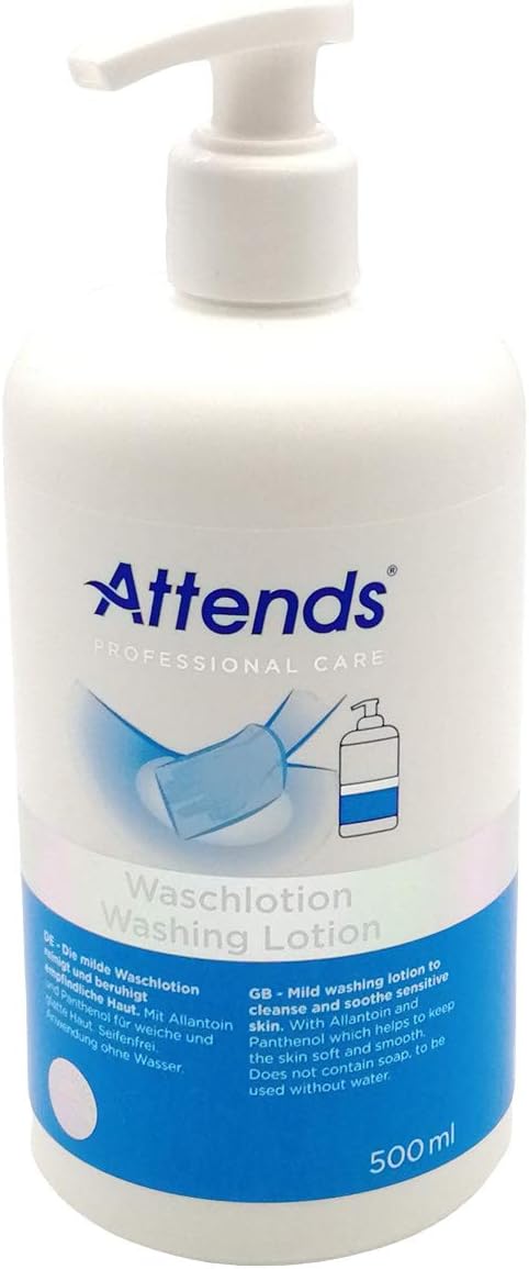 Attends washing lotion is a mild soap-free washing lotion designed to gently cleanse the skin. With Allantoin and Panthnol which helps to keep the skin soft and smooth. Use for daily washing and showering. Use in combination with water. 500ml bottle with pump-action dispenser,Mild cleansing lotion for soothing relief to skin,Enriched with chamomile extract,Handy 500ml bottle with pump-action dispenser,Alcohol free,Allantoin and Panthnol which helps to keep the skin soft and smooth
