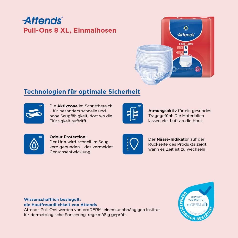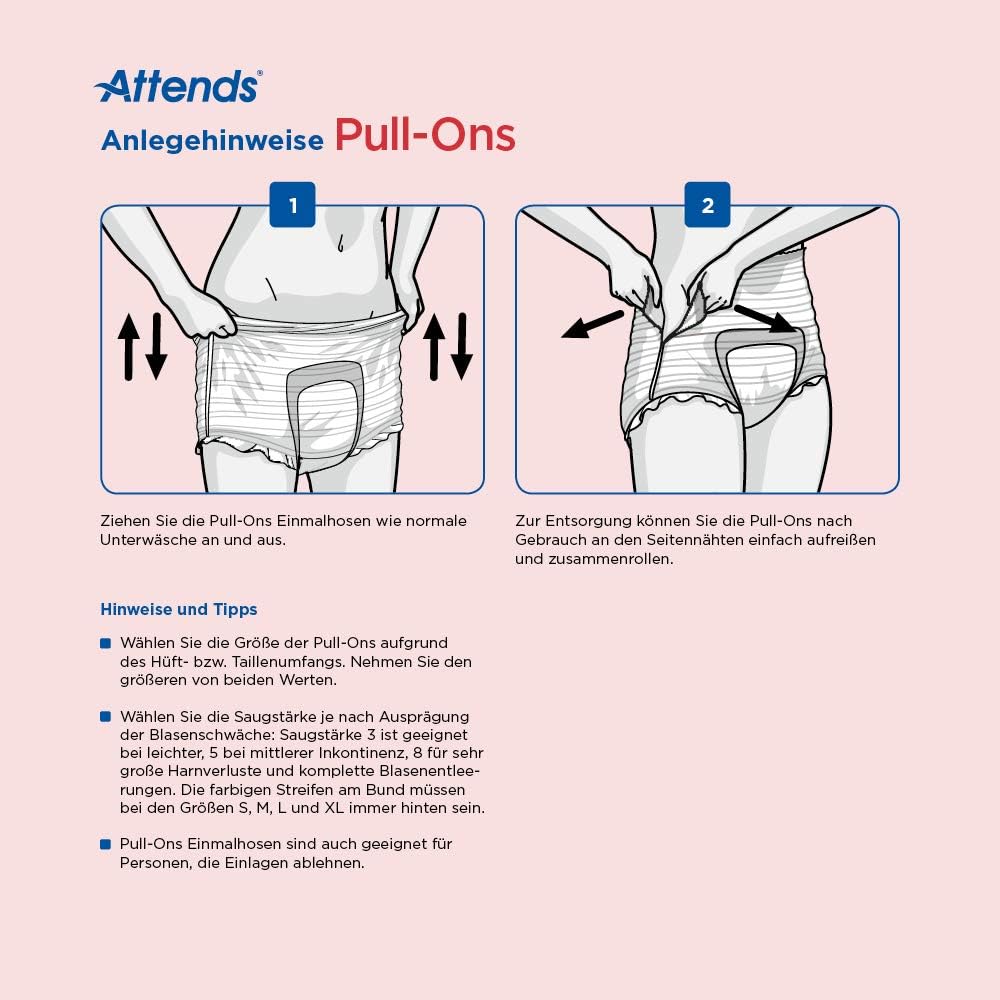 Product Description Attends Pull-Ons is a range of absorbent single use underwear that is used as a normal panties and is designed to manage moderate to severe urinary and/or fecal incontinence. Fitted with curved elastic around the legs for better protection against leaks and leak barriers to reduce the risk of leaks. Also contains an indicator of urination that helps in the good practice of care and that disappears as saturation: thus, it can serve as a guide to indicate when to change the protection. Directions Pull the protector up and down like regular underwear. Change the protector when the wetness indicator shows or when it reaches its absorbency limit (2100ml to 2499ml). Ensure a snug fit around the body using the elasticated waistband. Choose the protector based on the user's waist size (130cm to 170cm or 51 to 67 Inch). P.when('A').execute(function(A) { A.on('a:expander:toggle_description:toggle:collapse', function(data) { window.scroll(0, data.expander.$expander[0].offsetTop-100); }); }); Safety Warning Change product when wetness indicator shows. May cause skin irritation with prolonged use. See more,Super absorbent core,Natural odour protection,Breathable / micro-ventilated