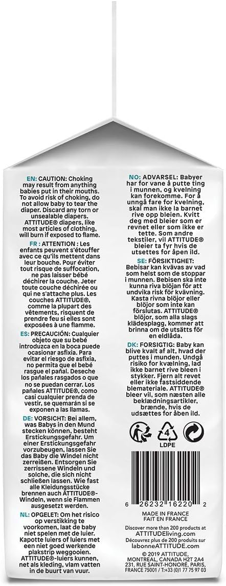 ATTITUDE Biodegradable Baby Diapers, Non-Toxic, Eco-Friendly, Safe for Sensitive Skin, Chlorine-Free & Leak-Free, Plain White (Unprinted), Size 1-2 (6-13 lbs), 36 Count (16220)
