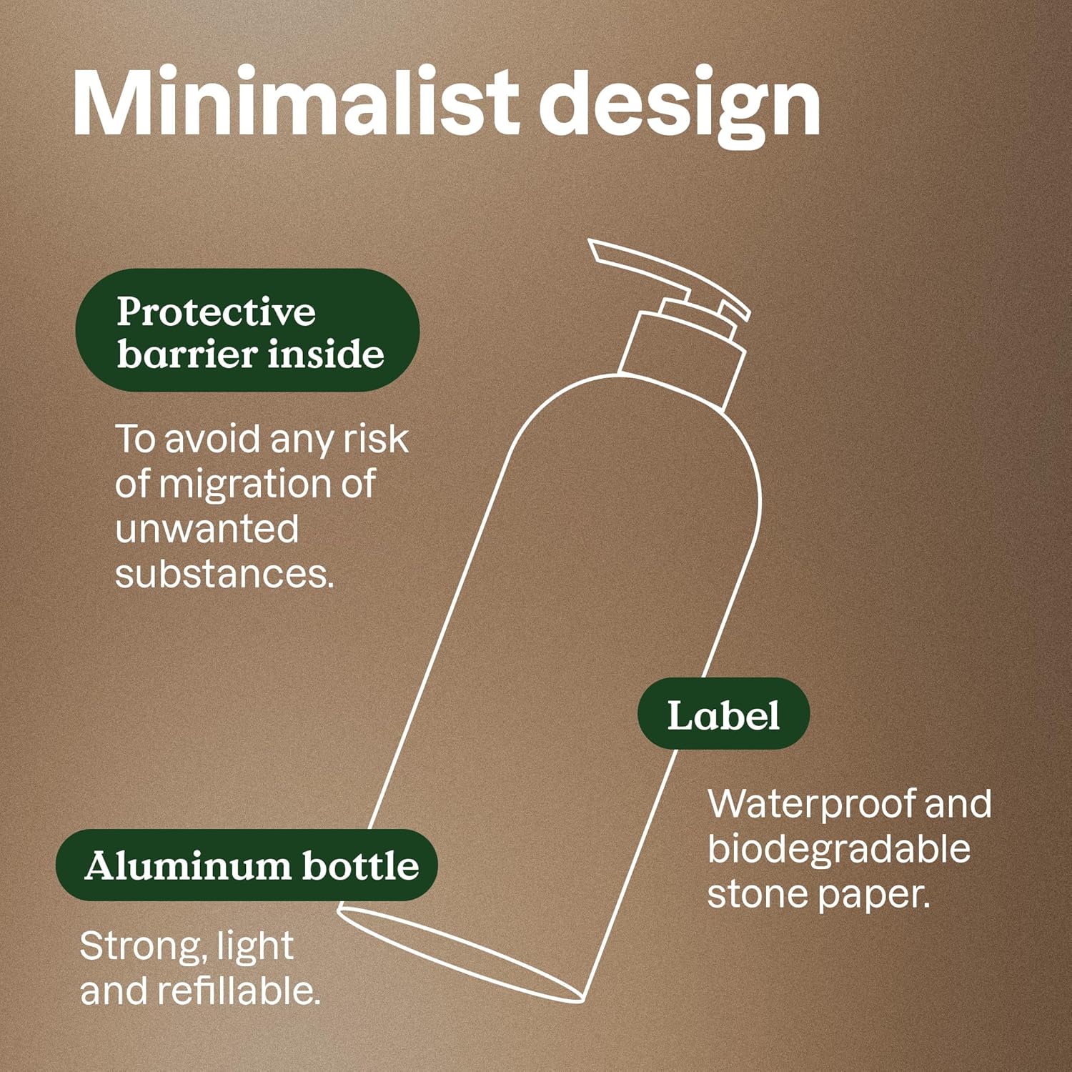 GOOD FOR THE PLANET: Aluminum bottle with a reusable pump designed to look good and be refilled infinitely to reduce plastic waste