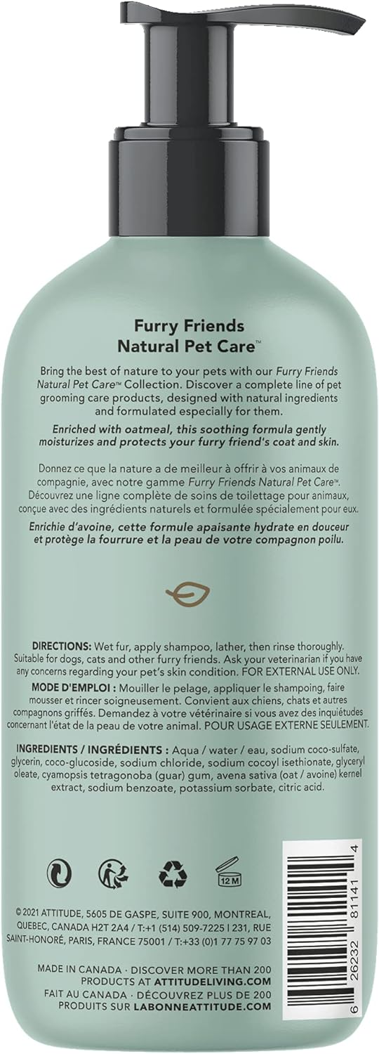 Take care of your pet's coat from ears to paws with ATTITUDE Furry FriendsSoothing Shampoo for cats, dogs, kittens and any other furry friend. Its formula made with natural ingredients such as emollient oats and moisturizing glycerin will leave your pet's coat soft and healthy. This practical shampoo and conditioner for pets is unscented and helps with shedding control! No more smelly dog: bathe your pet in the comfort of your home!NATURAL SHAMPOO FOR DOGS AND LONG HAIRED CATS : Made with oats and glycerinHYPOALLERGENIC SHAMPOO FOR PETS: Dermatologically testedCRUELTY-FREE, VEGAN SOOTHING SHAMPOO FOR PETS: Certified by PETABIODEGRADABLE NATURAL SHAMPOO FOR ANIMALS: The surfactants in this product were made from renewable raw materials such as coconut oil