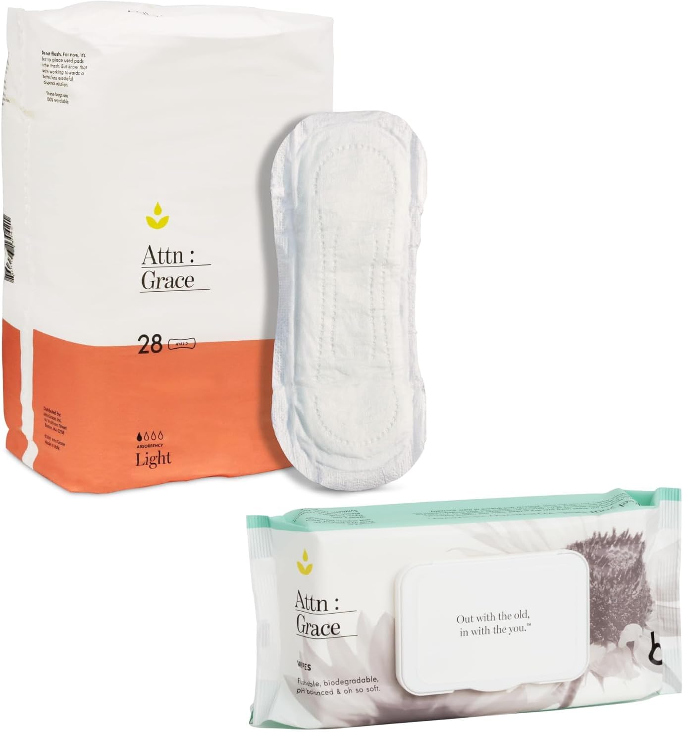 Attn: Grace Hybrid Incontinence Pads (28 Pack) & Flushable Wet Wipes Combo for Women - Light Absorbency & Wipes with Aloe Vera and Coconut Oil | Postpartum Support, Sensitive Skin-Friendly, Breathable