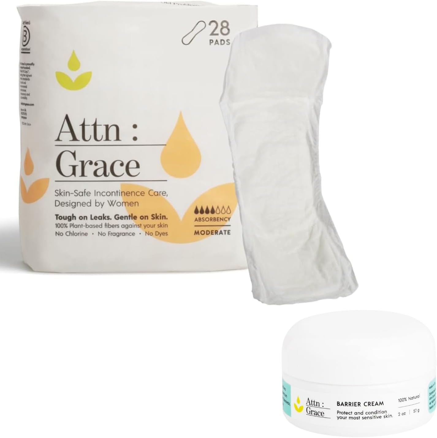 Attn: Grace Moderate Incontinence Pads (28 Pack) & Barrier Cream Combo For Women - Moderate Absorbency | Postpartum Support, Sensitive Skin-Friendly, Breathable, Plant-Based