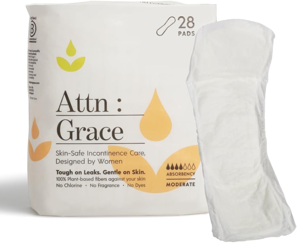 Attn: Grace Moderate Incontinence Pads For Women (28-Pack) - Discreet High Absorbency Sensitive Skin Protection - Medium Bladder Leaks Or Postpartum - 100% Breathable And Plant-Based