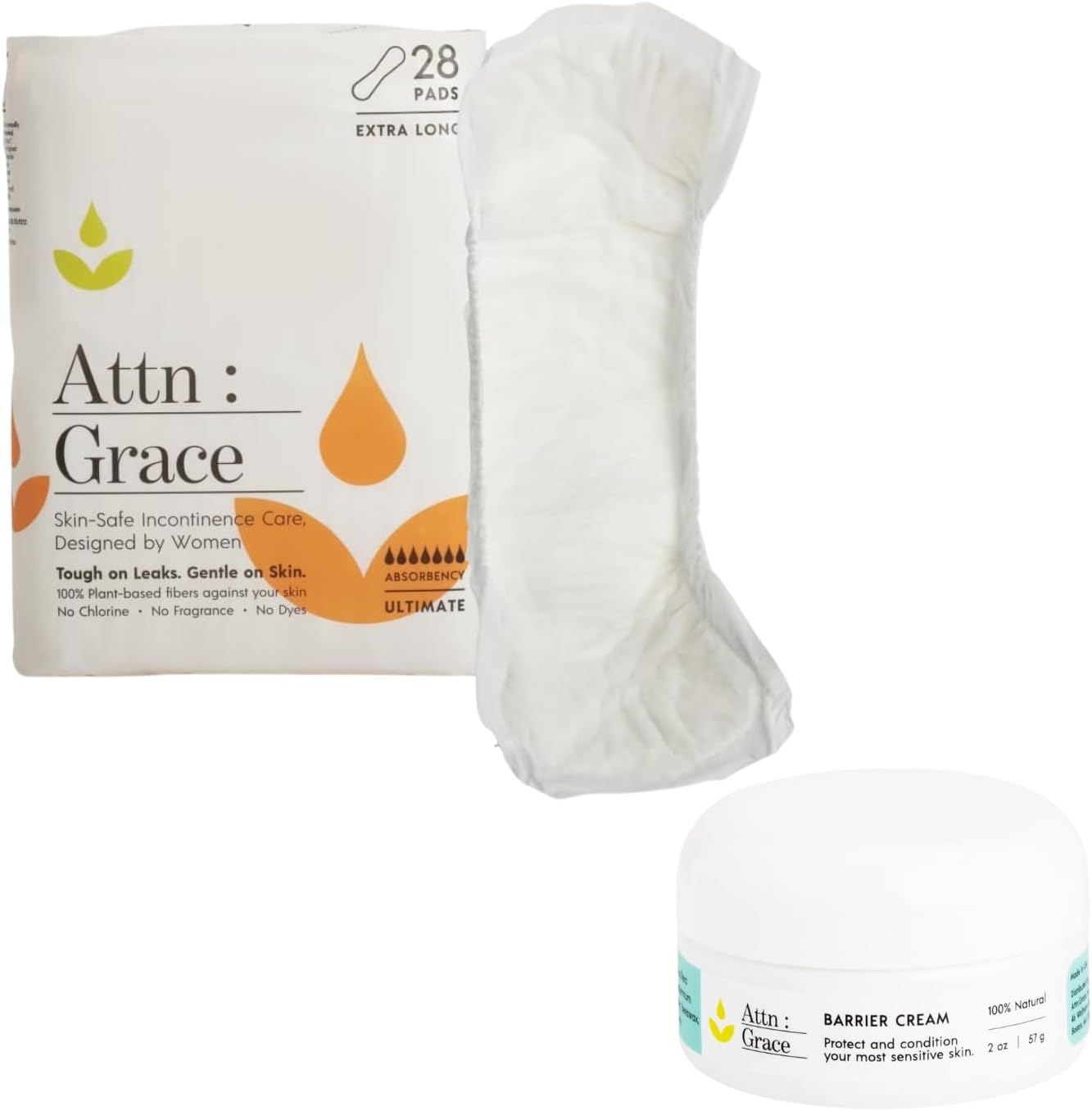 Attn: Grace Ultimate Incontinence Pads (28 Pack) & Barrier Cream Combo For Women - Ultimate Absorbency | Postpartum Support, Sensitive Skin-Friendly, Breathable, Plant-Based