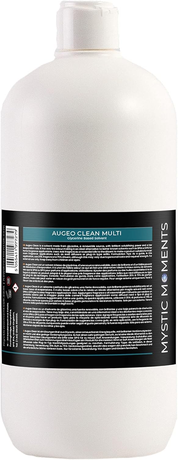 Product description Augeo Clean Multi - 1 Litre Description: Augeo Clean is a solvent made from glycerine, a renewable source, with brilliant solubilising power and a low evaporation rate. It has very low odour making it an ideal alternative to better known solvents such as DPM or DPG for home fragrance applications. Uses: Add fragrances or essential oils to the diluent to make a product suitable for most room fragrance applications such as reed diffusers or plug-in type refills. Formulation Tips: As a guide, in this application, use 25% fragrance to 75% diluent, although this may vary due to personal taste and required strength. Do not consume. For external use only. Keep away from children and eyes. Ingredients glycerine