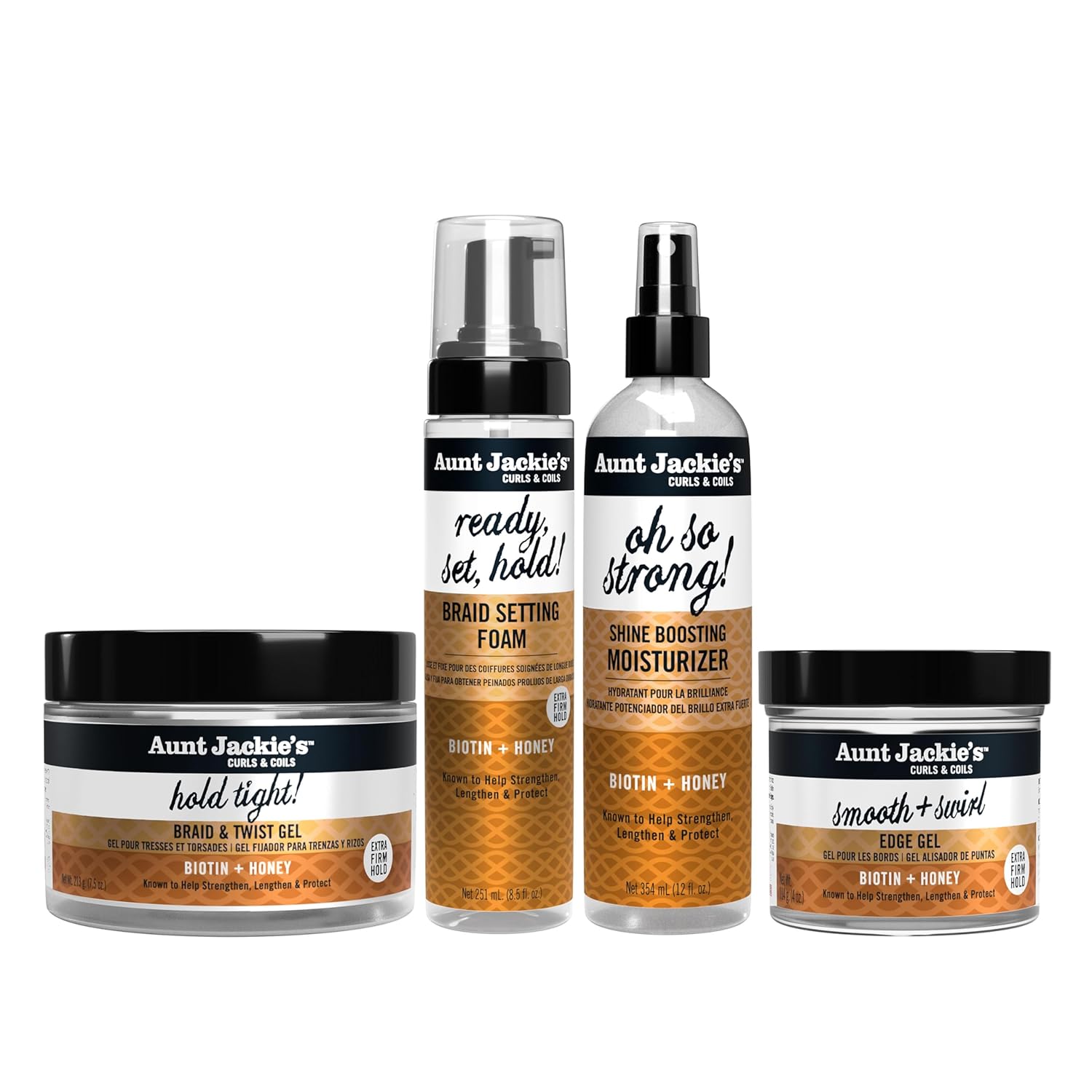 Finish strong! You can create sleek braids, twists, locs, and protective styles with Aunt Jackieās Braid + Twist Collection Ready, Set, Hold Braid Setting Foam with Extra Firm Hold. Specially blended with the dynamic duo of Biotin + Honey, this lightweight, extra firm hold setting foam revives frizzy, dull hair to reveal a sensational shine. Lavish Honey supports moisture retention, while protein-rich Biotin reveals the natural beauty of braids, locs, and twists. It gently smooths frizz and flyaways, while helping to strengthen, lengthen, and protect hair. Directions: To care for Braids, after braid style is complete, apply a generous amount and gently smooth over the braids. Dry hair using a blow dryer for 3-5 minutes. For Drying On-Scalp Braids: Cover front of braid style with a wrap styling strip before drying. Remove strip after drying. For Braid Maintenance: Apply a few pumps to braids and gently smooth frizz and flyaways. Wrap with a silk scarf for at least 5 minutes to set smoothness. For beautiful braids, twists, and locs, use the full Aunt Jackieās Braid + Twist Collection,DESIGNED FOR: Braids, twists, locs,and protective styles,BIOTIN + HONEY HELPS STRENGTHEN, LENGTHEN, & PROTECT HAIR: Biotin is protein-rich and helps improve hair volume and strength; Honey lavishly adds shine and supports moisture retention,CREATE & MAINTAIN: Achieve and sustain stunning braids, twists, locs, and natural hairstyles with ease,VERSATILE USAGE: Suitable for every hair type and texture; Incorporate into your daily routine as needed,AUNT JACKIE'S MISSION: Quality Products. Healthier Hair. Aunt Jackie's inspires beauty in women, men, and children by providing reliable beauty care solutions that help you look & feel your best as you seek to live your best life. Whether you have curly, wavy, or coily hair, Aunt Jackieās has created a special blend of products designed to nourish, hydrate, and define your natural texture