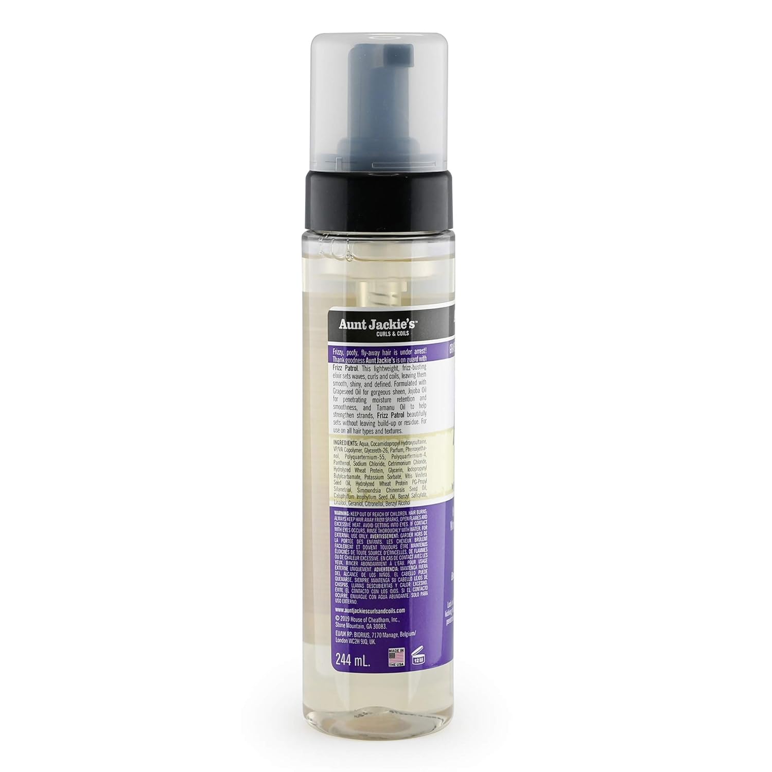 Frizzy, poofy, fly-away hair is under arrest! Thank goodness Aunt Jackieās is on guard with Frizz Patrol. This lightweight, frizz-busting elixir sets waves, curls, and coils, leaving them smooth, shiny, and defined. Formulated with Grapeseed Oil for gorgeous sheen, and Tamanu & Jojoba Oils for penetrating moisture retention, and smoothness, Frizz Patrol beautifully sets without leaving build-up or residue. For use on all hair types and textures,8.5 fl oz of Aunt Jackie's Frizz Patrol Setting Mousse,Lock in lightweight hold, smoothness and shine, while kicking your hair's frizz,Hydrating elixir sets curls, waves, coils and textured hair styles in place,Helps strengthen and improve elasticity,Enriched with jojoba and tamanu oils