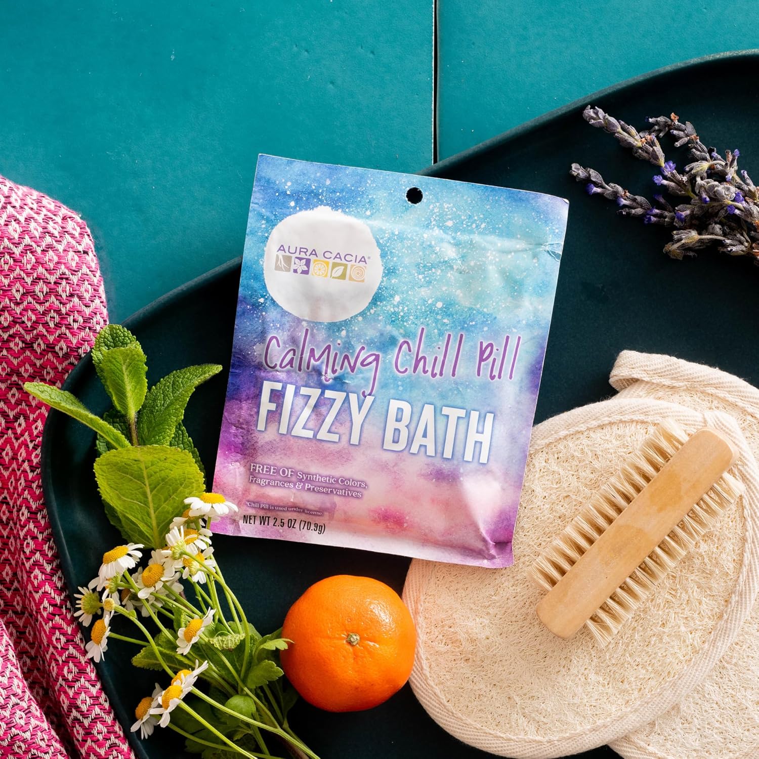 Aura Cacia Calming Chill Pill Fizzy Bath 2.5oz,CHILL PILL FIZZY BATH - A unique blend of calming lavender, refreshing citrus, and balancing patchouli that leaves the skin soft and smooth,HOW TO USE - Drop into your bath for a relaxing and rejuvenating soak that nourishes the skin,ETHICALLY MADE - Aura Cacia products are never tested on animals, and never contain synthetic colors or fragrances. All of our essential oils are GC/MS tested and are completely paraben and petroleum free,AURA CACIA'S PROMISE - When it comes to pure essential oils, it all begins at the botanical source. Aura Cacia is committed to delivering essential oils from all over the globe with integrity and botanical authority,ABOUT US - Aura Cacia was founded over 40 years ago on pure essential oils and true aromatherapy benefits. Most importantly, we're part of a member owned co-op that puts people and planet ahead of profits